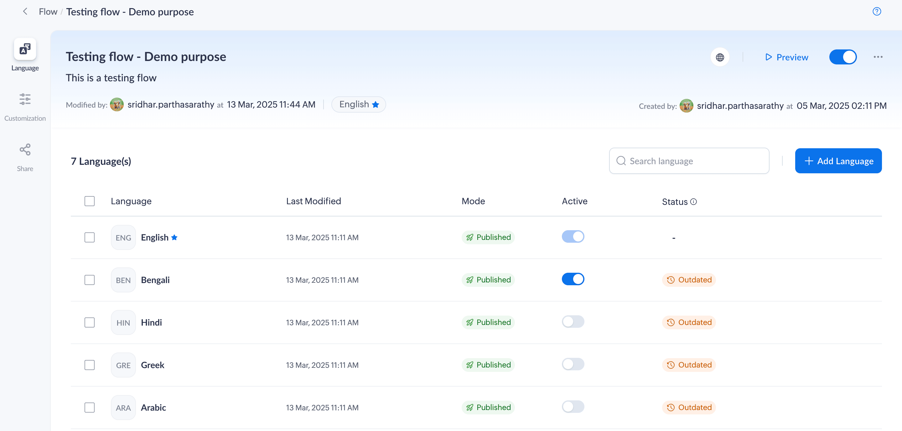 GC supports multilingual flows, allowing languages to be added while creating a GC flow. This enables customers to engage in their preferred language, enhancing engagement, reducing misunderstandings, and increasing overall satisfaction. Multilingual flows can be accessed from the Centralized dashboard of the flow.