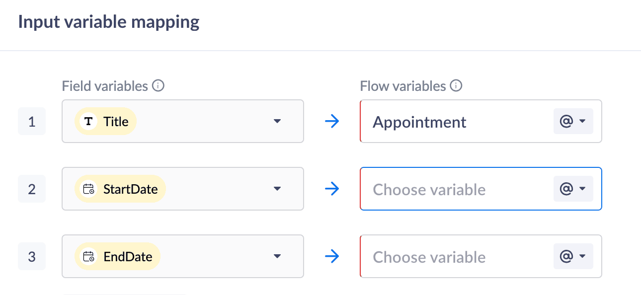 Input Variable Mapping enables the transfer of user-provided or manually entered data to Zoho Calendar, ensuring a relevant response. This is accomplished by mapping flow variables to corresponding Calendar variables.