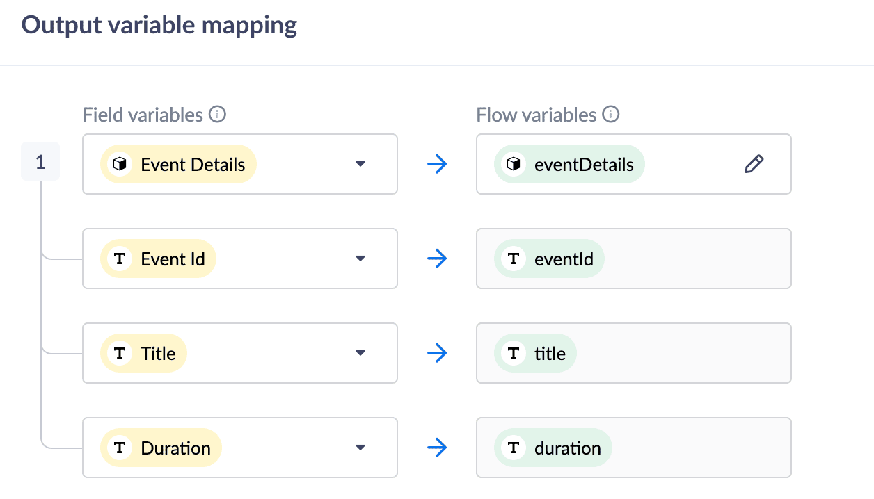 Output variables store the response received from Zoho Calendar after performing the action. These variables can be used within the GC flow to confirm the status or display relevant details to the user.