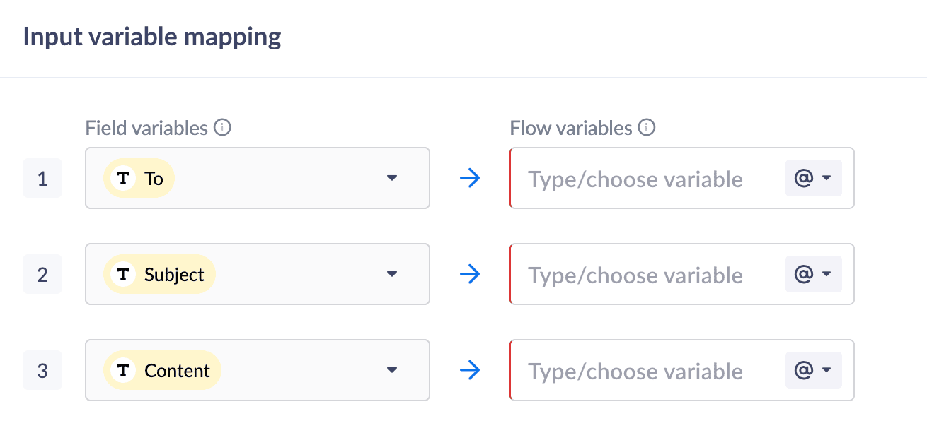 Input Variable Mapping enables the transfer of user-provided or manually entered data to Zoho Mail, ensuring a relevant response. This is accomplished by mapping flow variables to corresponding Zoho Mail variables.