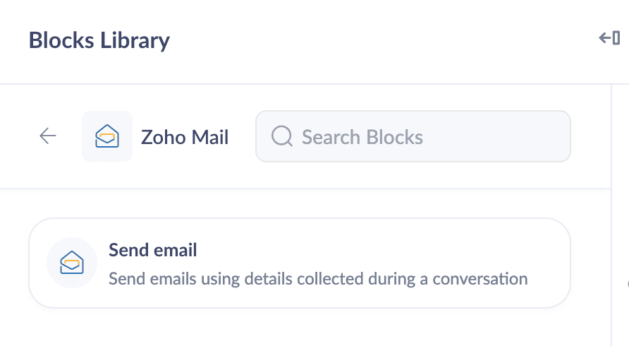 The Zoho Mail integration blocks allows you to send emails directly from GC based on user interactions and gathered data. This block is particularly useful for automating communication tasks such as confirmations, follow-ups, and notifications.