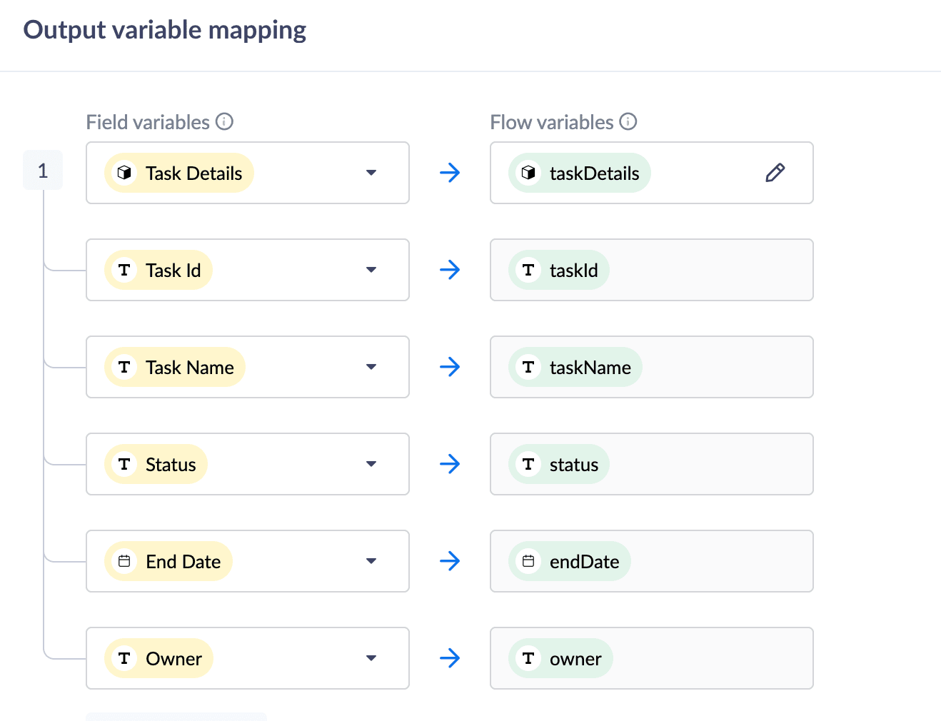 Output variables store the response received from Zoho Projects after performing the action. These variables can be used within the GC flow to confirm the status or display relevant details to the user.