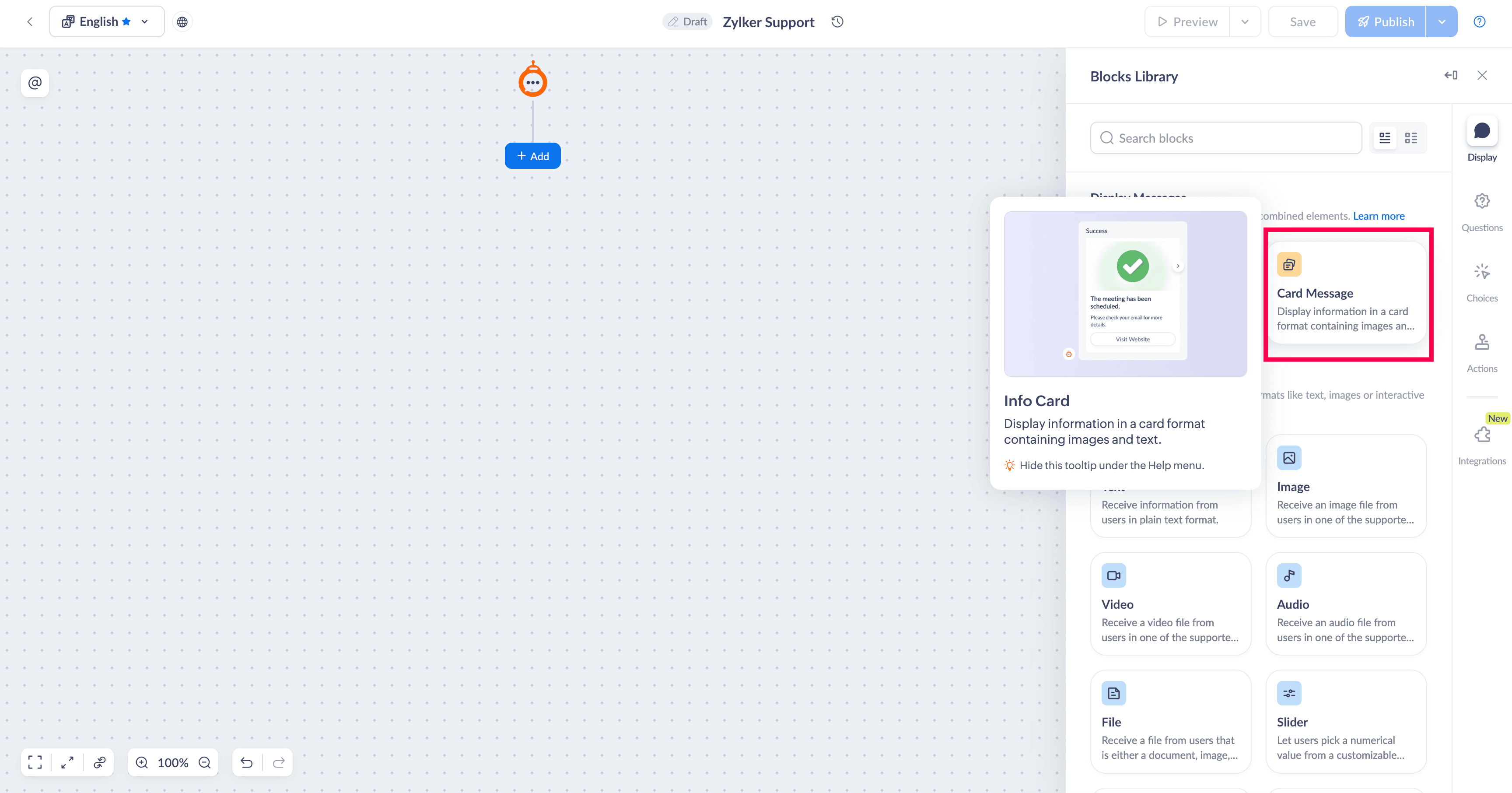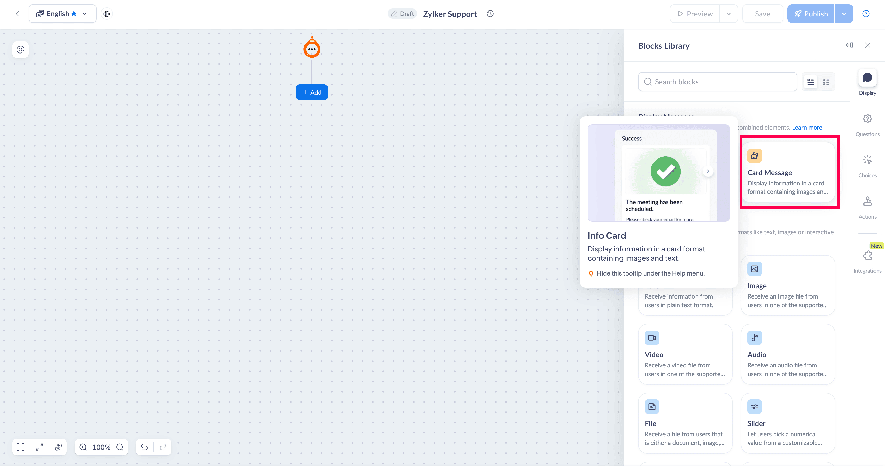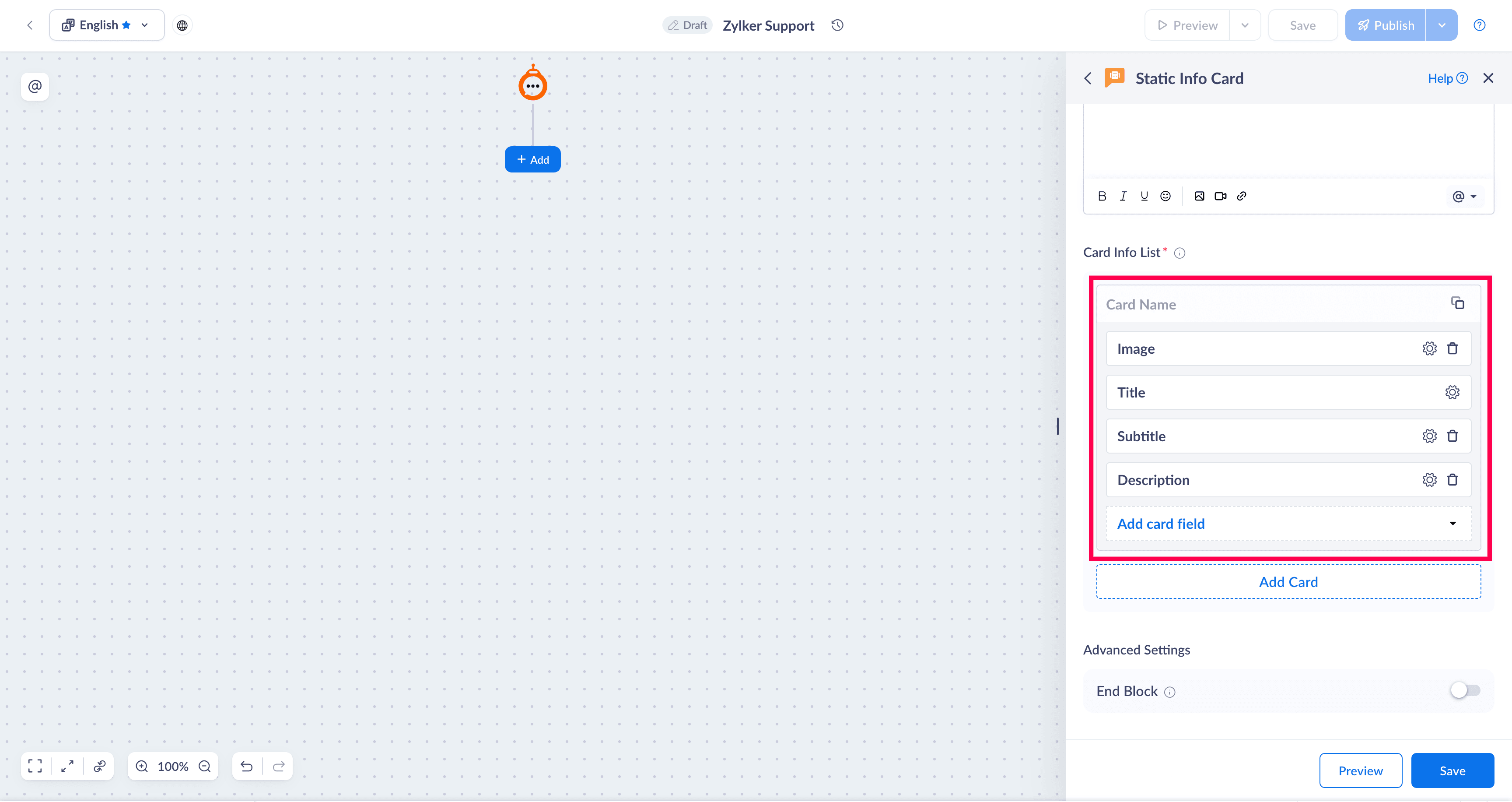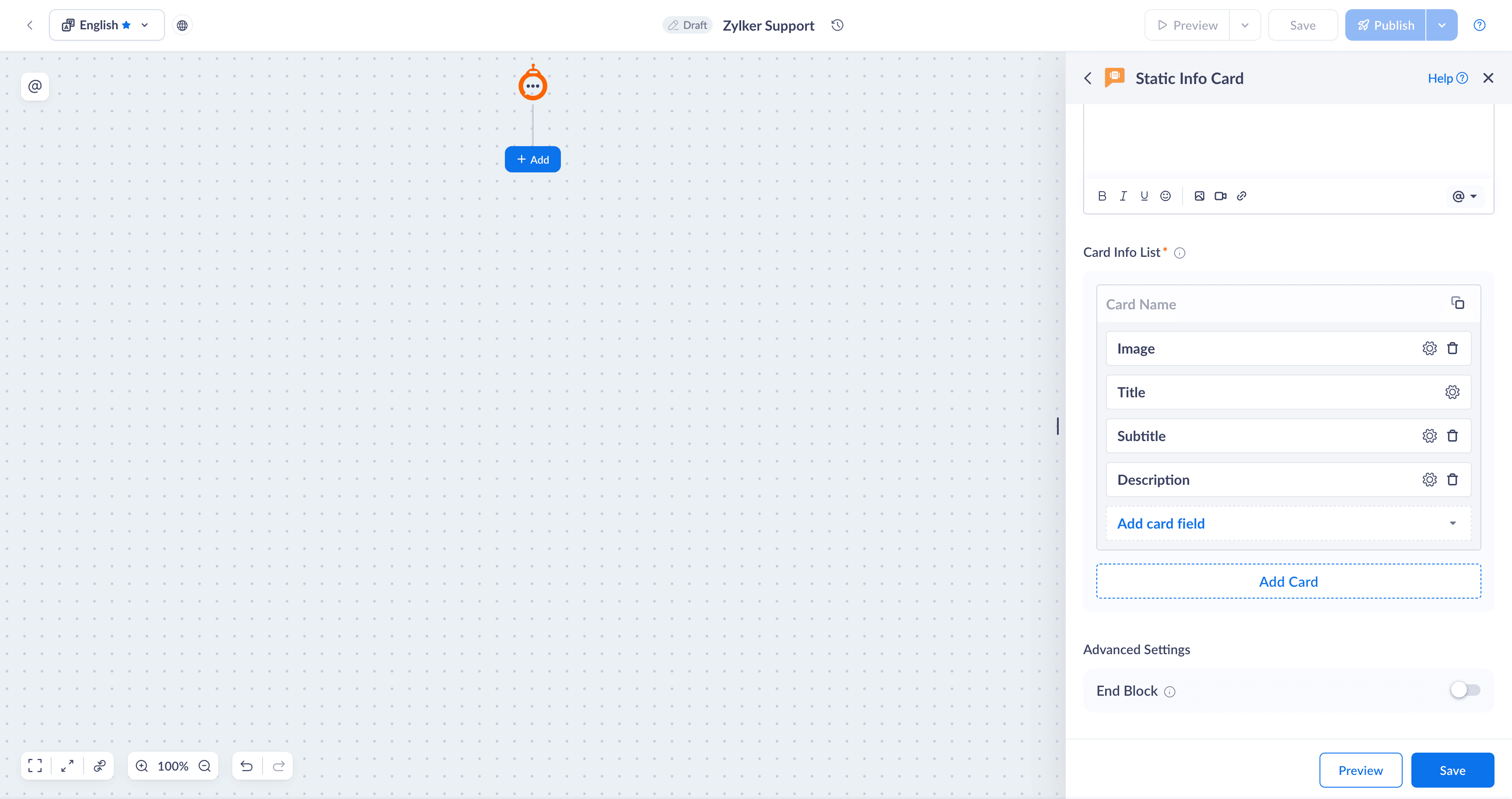1. To add the Static Info Card block to the flow, click the add block icon (+).