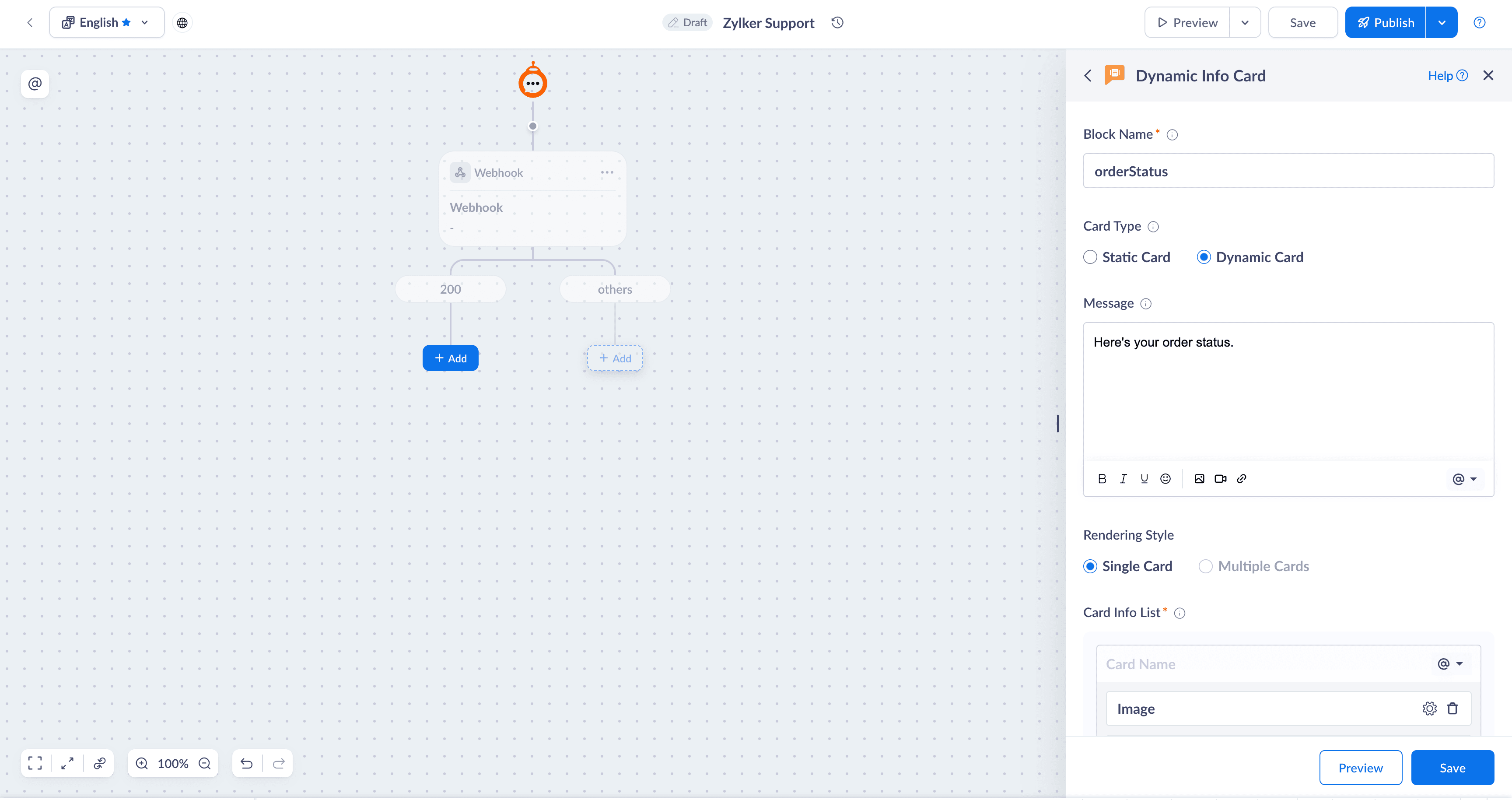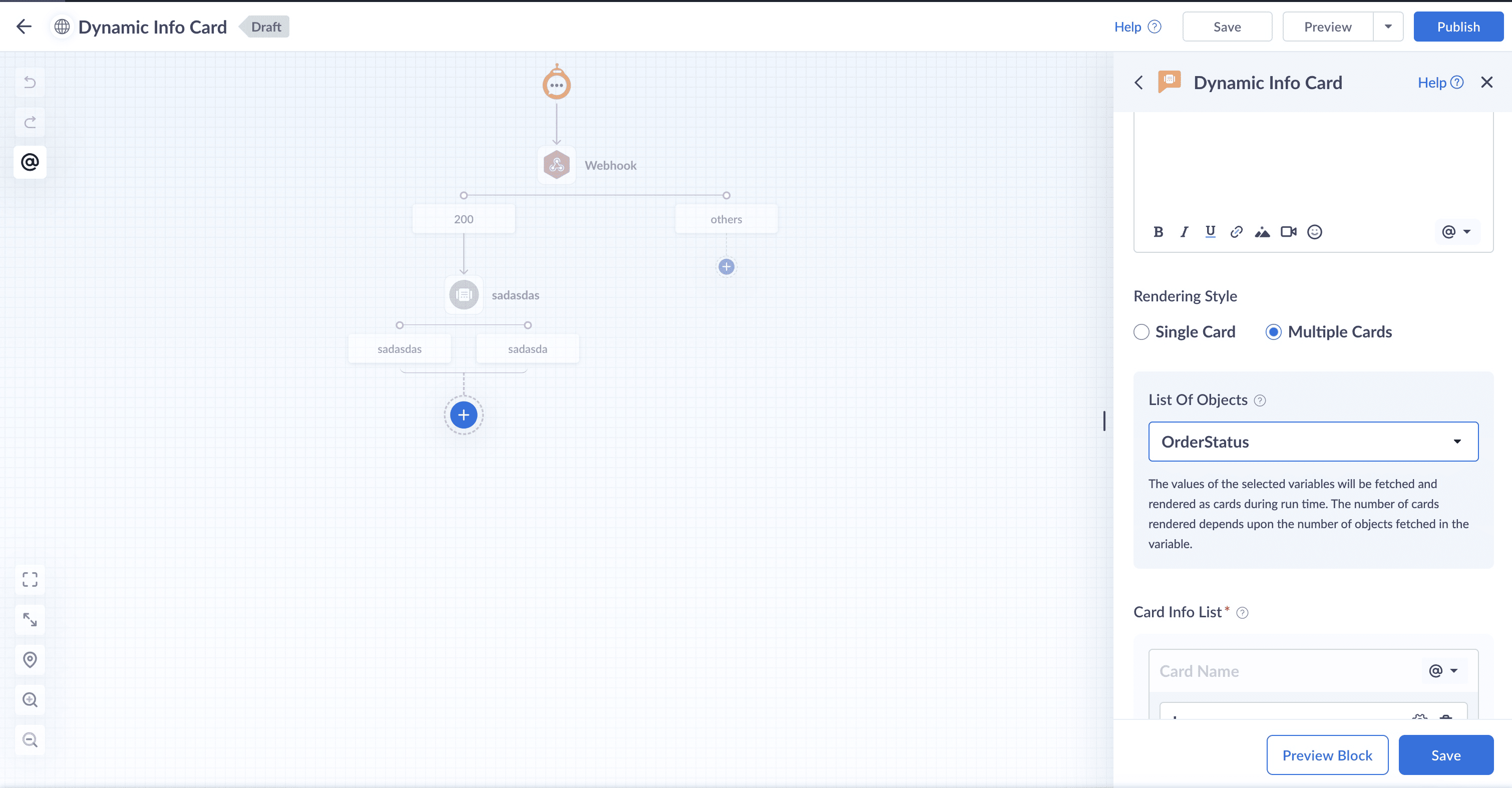 At times, there are requirements where we would need to present a list of items that isn’t static and can change over time, making it impractical to set a fixed number of buttons or create flows for every possible scenario. The dynamic info card enables you to fetch information from an external source in the form of an array and display it to your users.