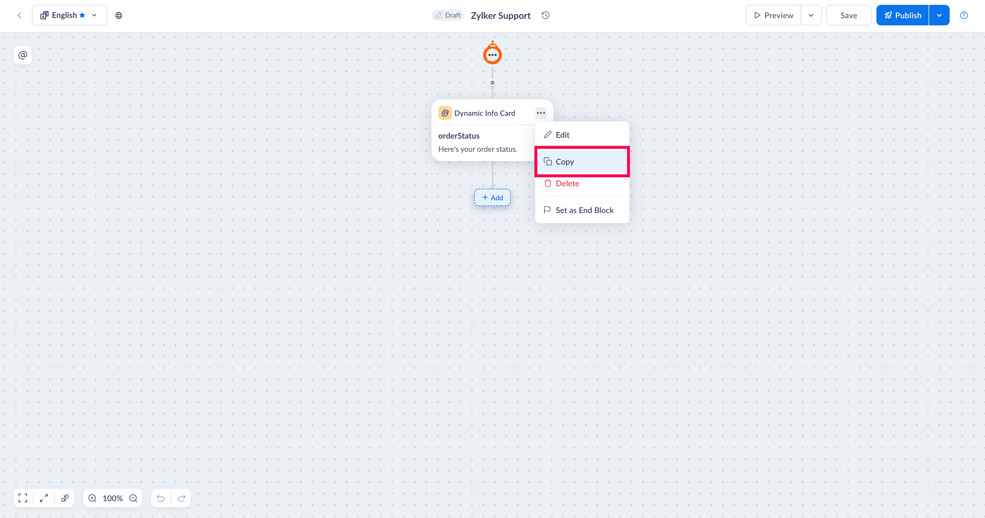 When copying an existing info card block, all of its content, including variables, if any, will be copied as is. You can edit it as needed before adding it to the flow. Since the names of each block must be unique, the word '_copy' will be added to the copied blocks automatically; this can be changed if required.