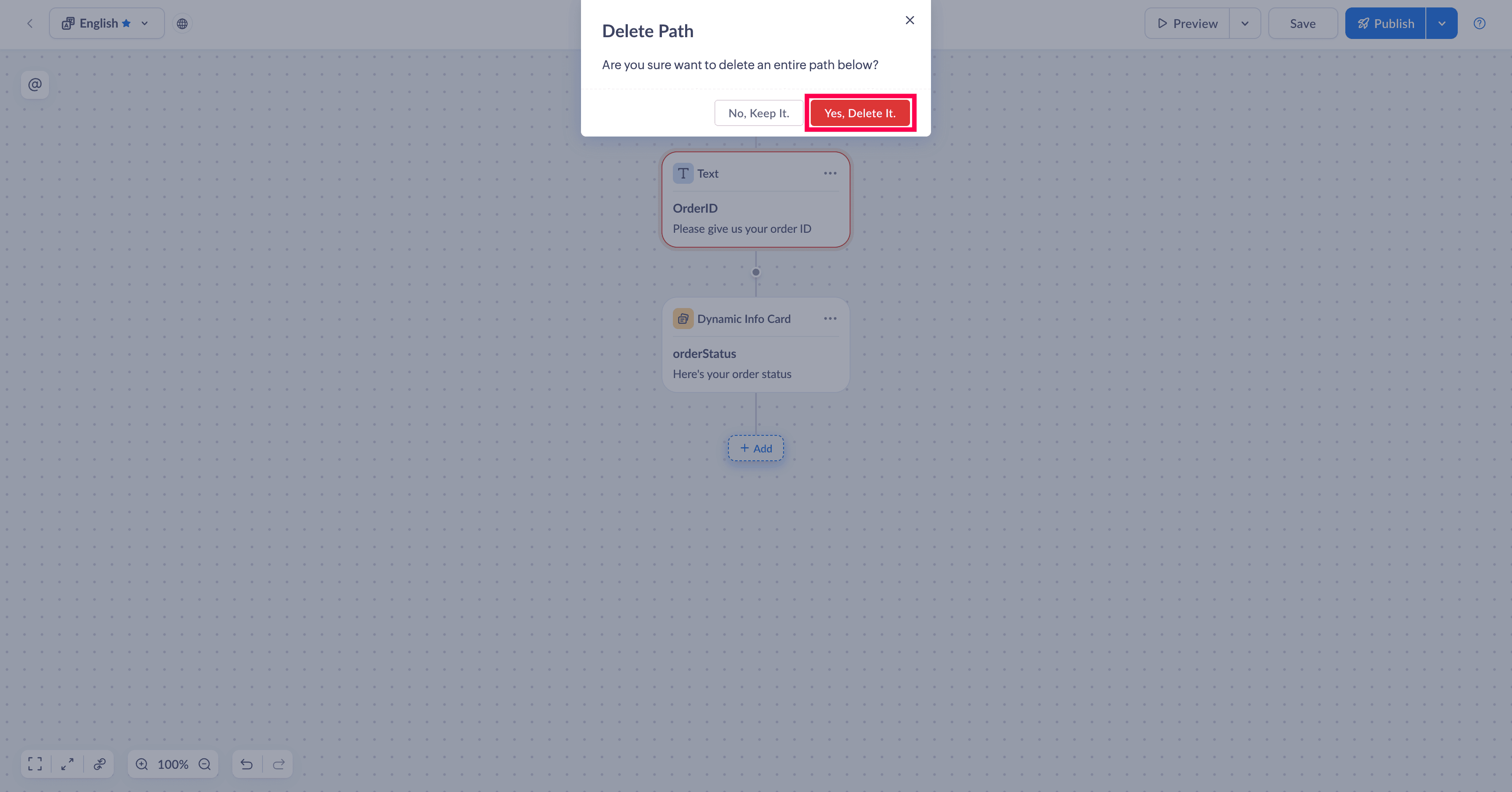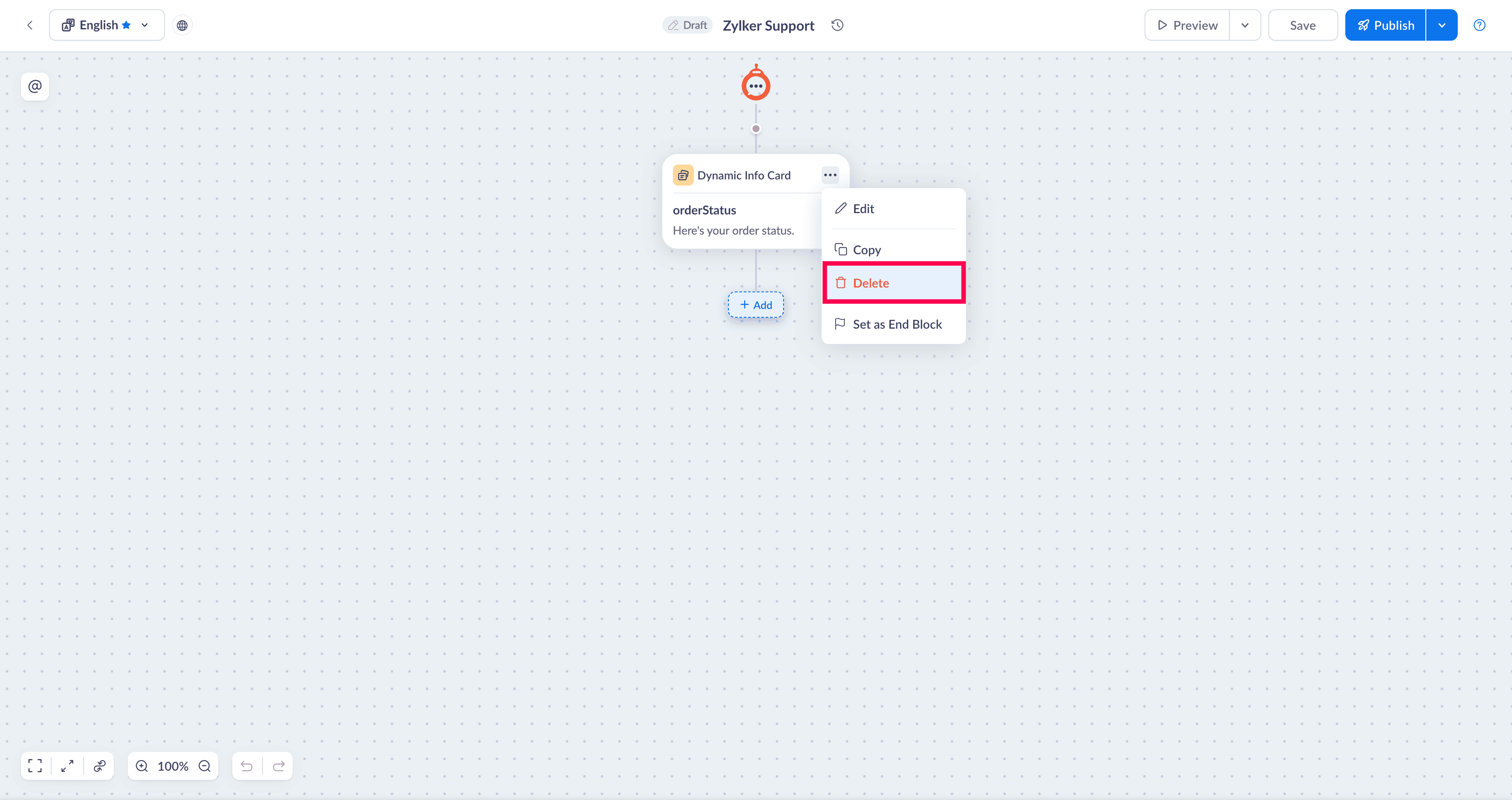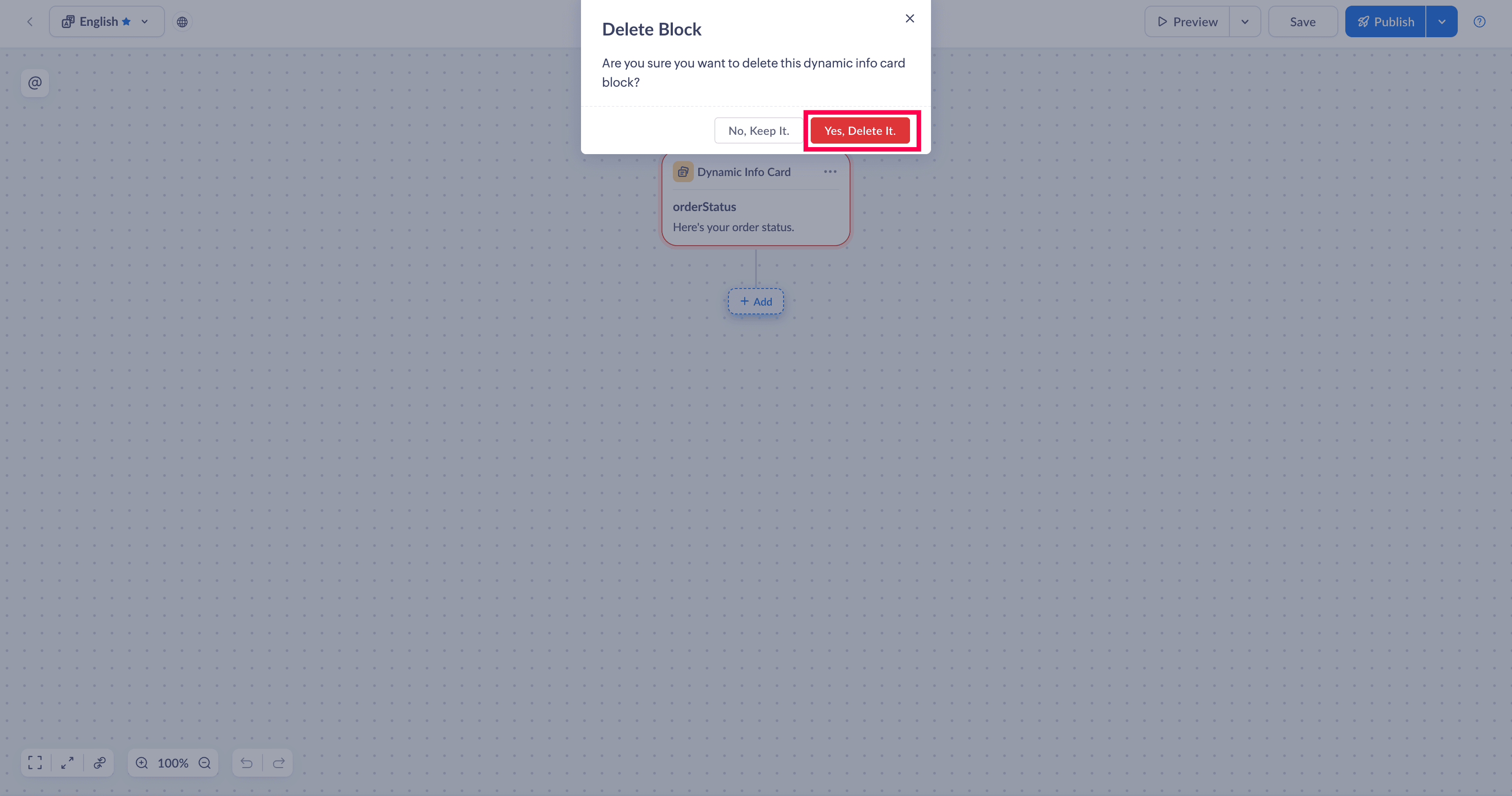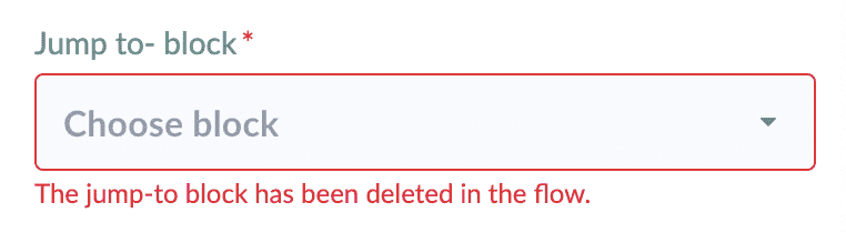 - If you delete a block while an end user is engaged in a live session with the bot, the previous version of the flow will be rendered until they restart the conversation.