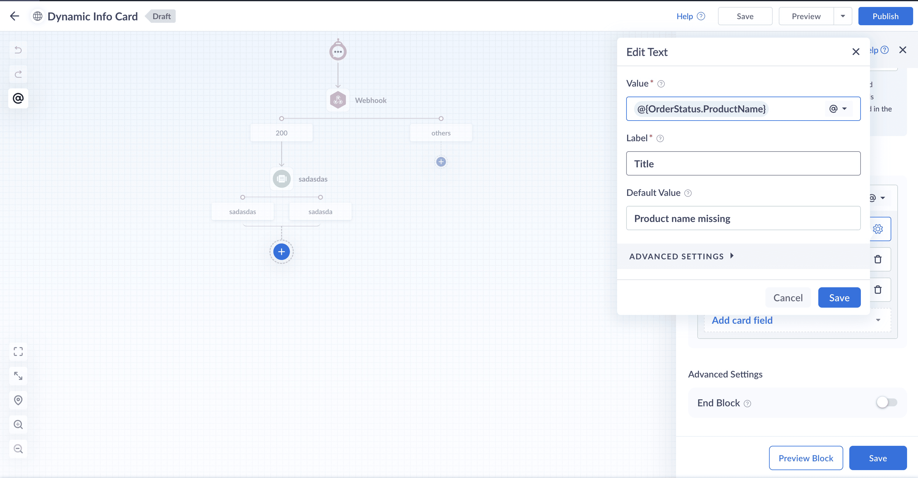 A default value can be assigned to the Title field. This value will be used as the card's title if the variable designated for the Title receives an empty response. Default value feature is only available for the Title field because it's a mandatory field.