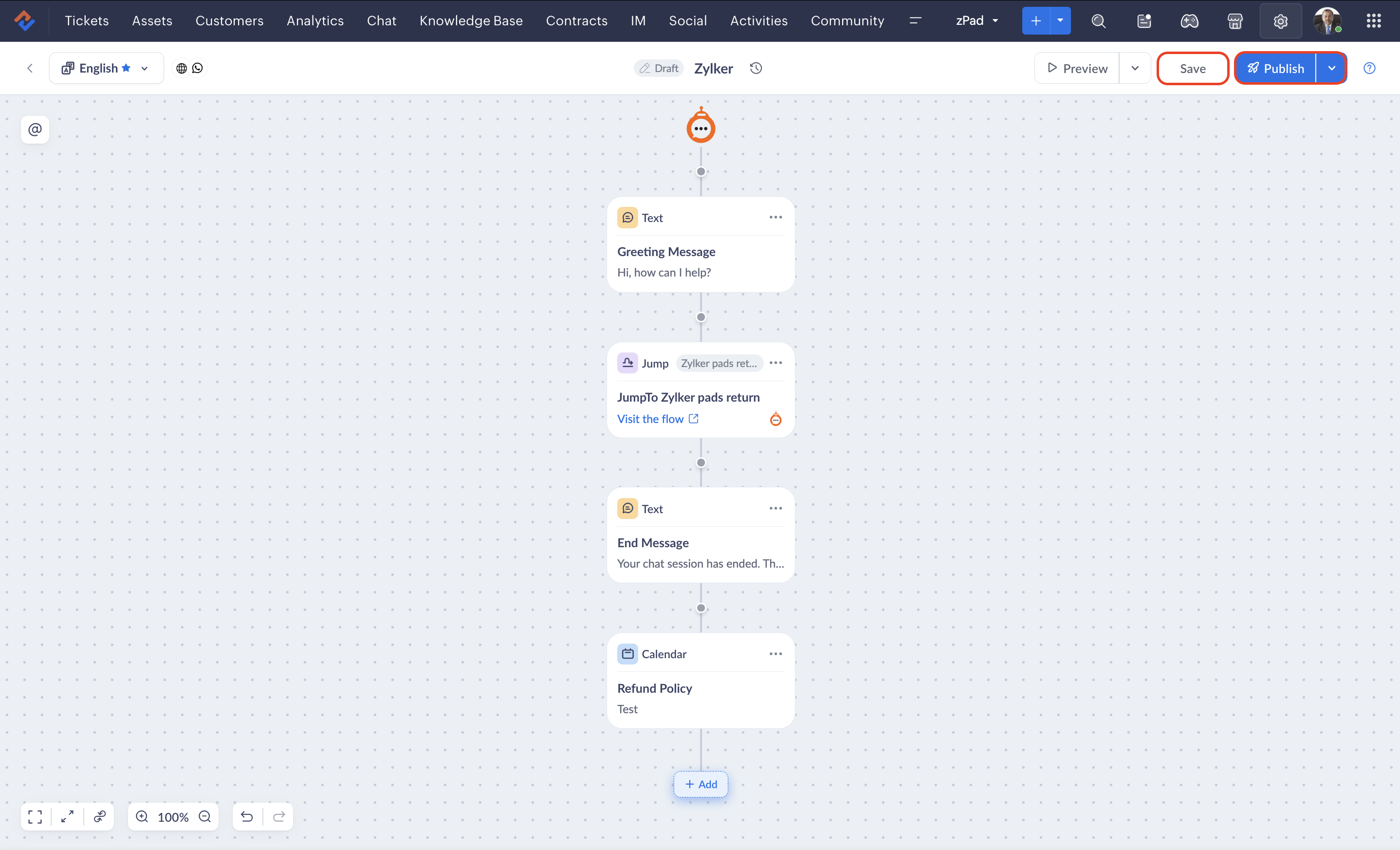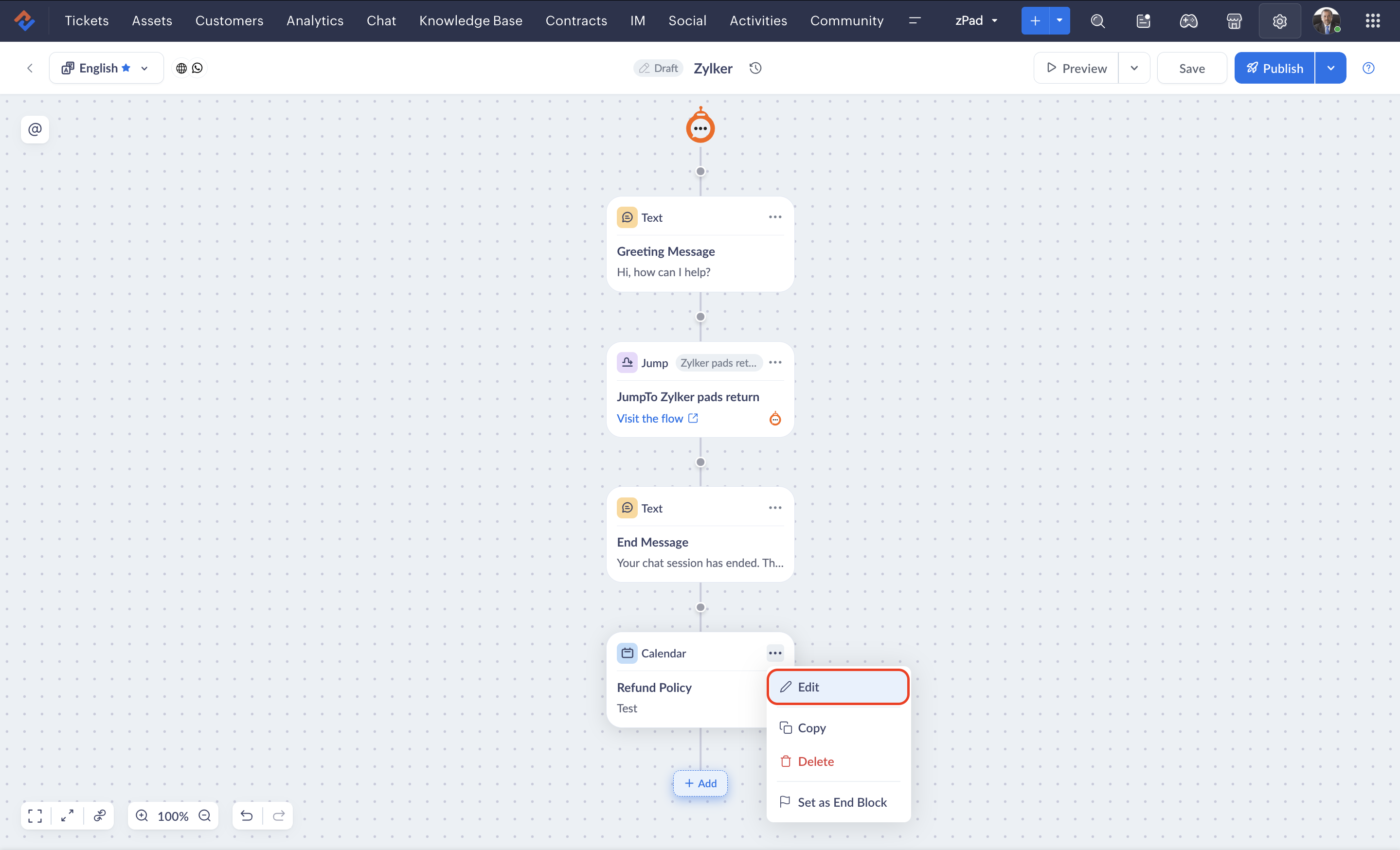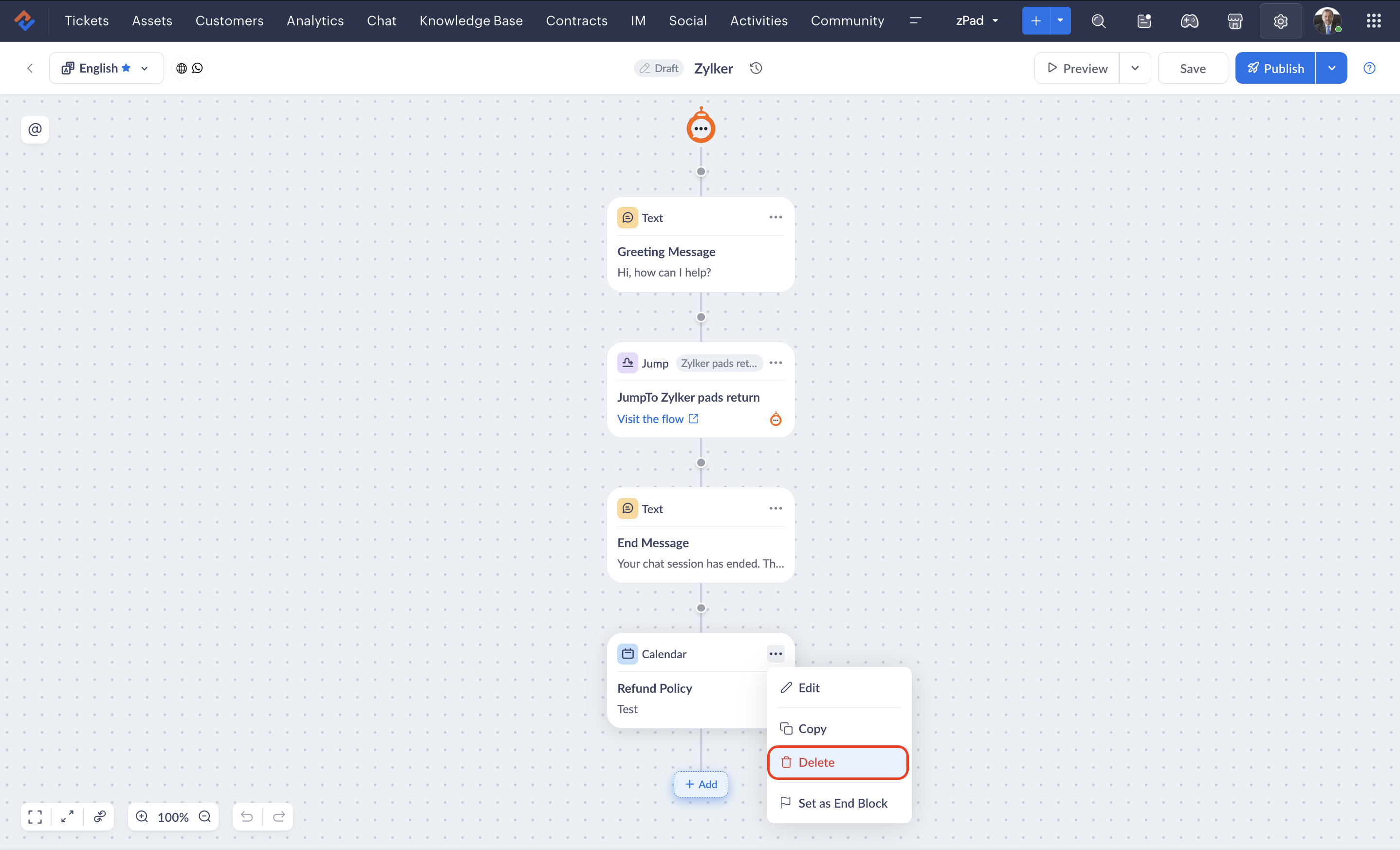 - If you delete a block while an end user is engaged in a live session with the bot, the previous version of the flow will be rendered until they restart the conversation.