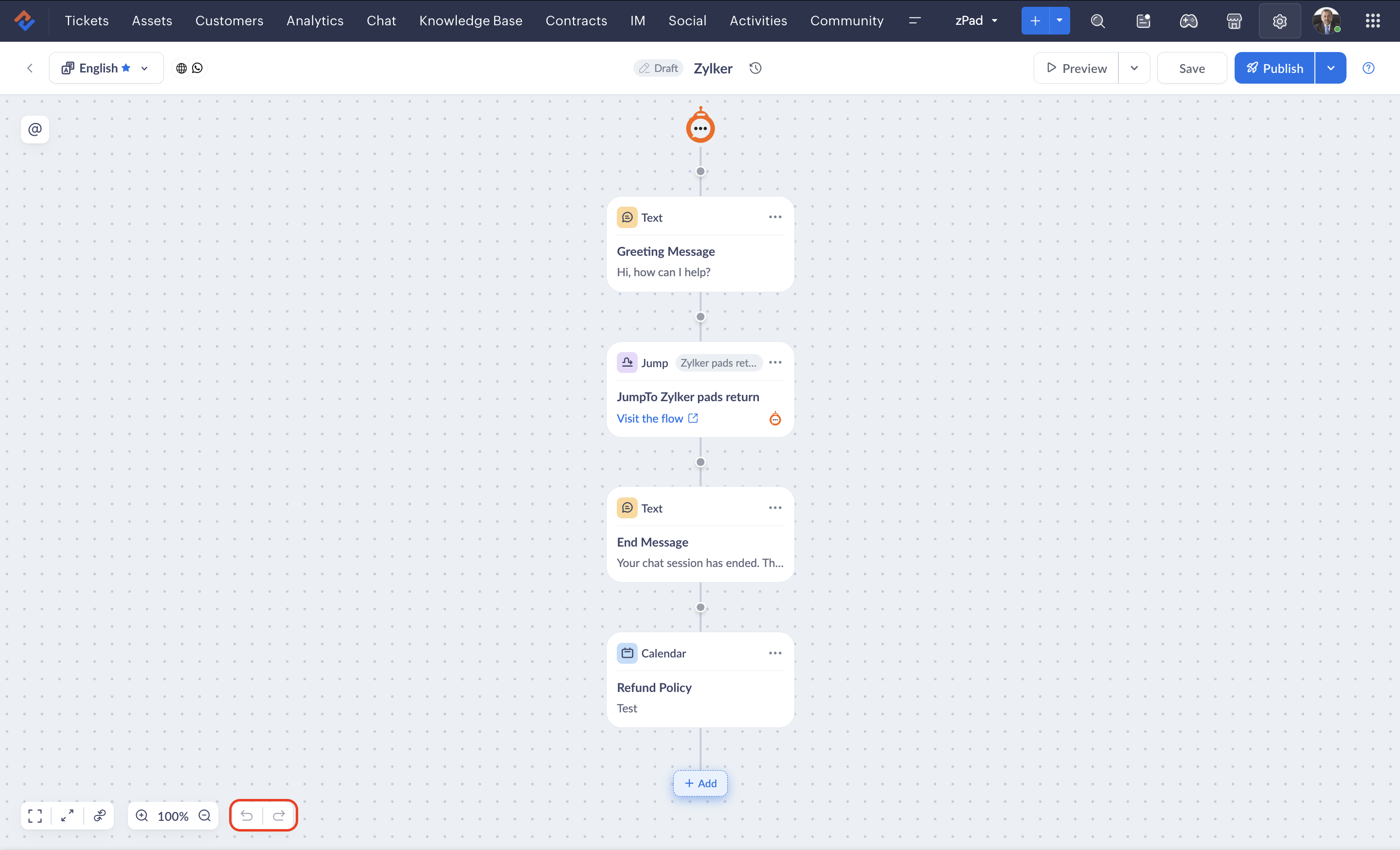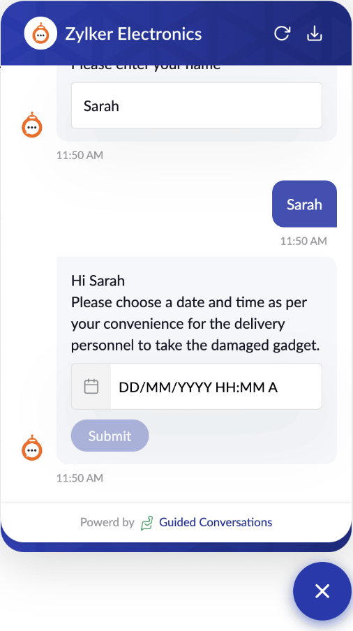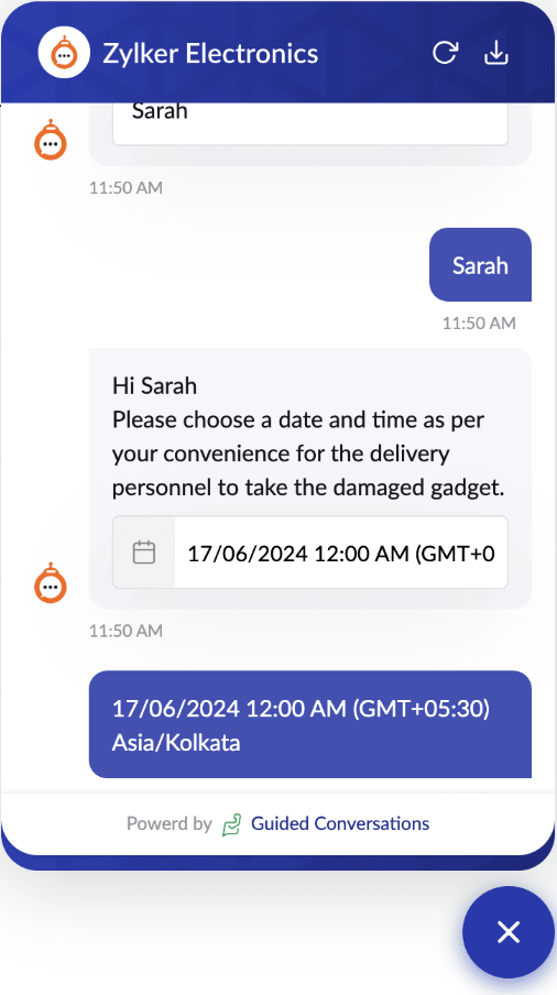 From an online store selling store named Zylker electronics, the customer had received the order but was facing an issue with the gadget. He immediately checks their website and starts a conversation with the bot. After validating their return request, the bot guides them to select a date and time for the delivery personnel to collect the damaged gadget.
