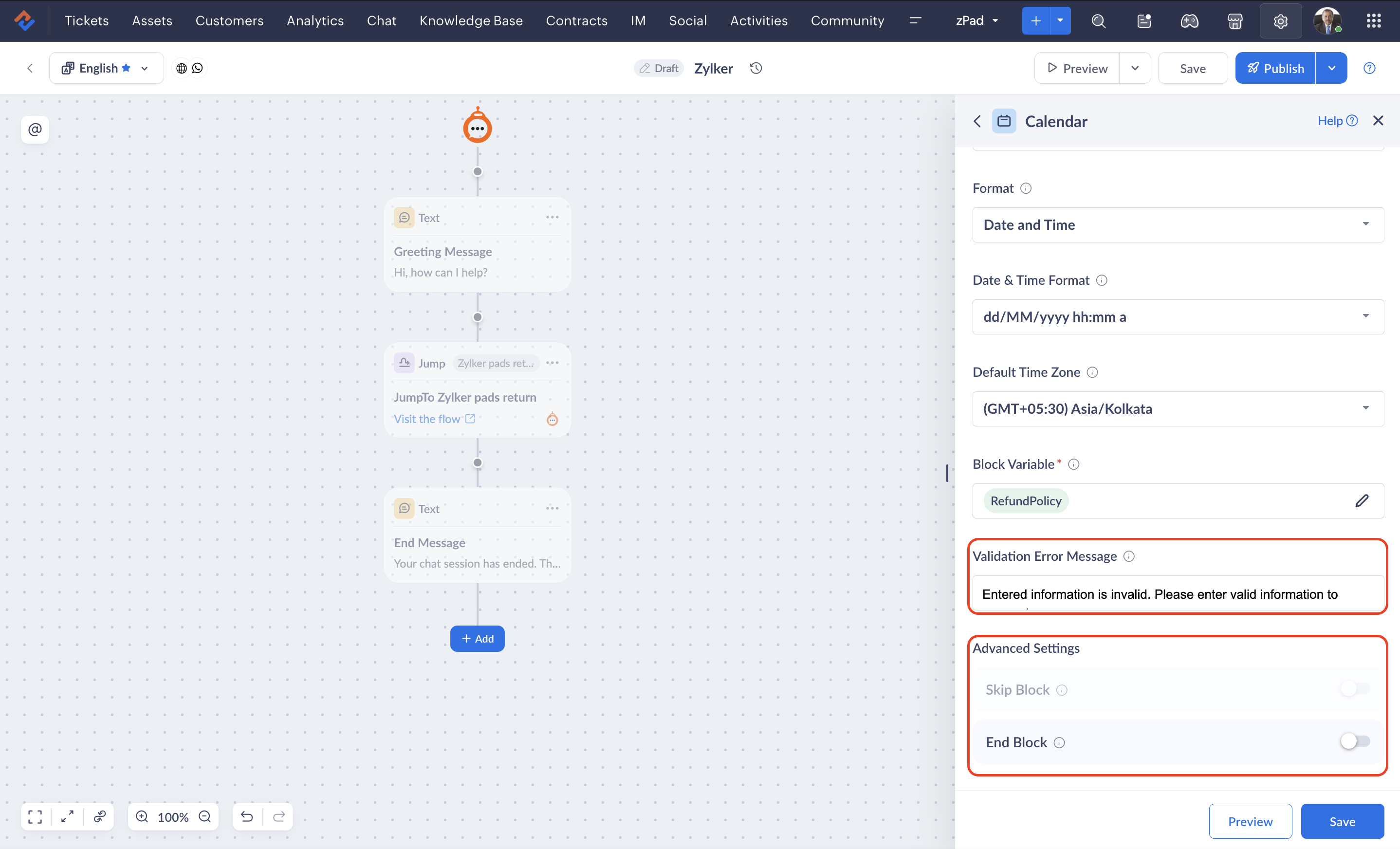 Adding the Calendar block to your chatbot flow ensures accurate input validation and simplifies the process of scheduling appointments or deliveries.