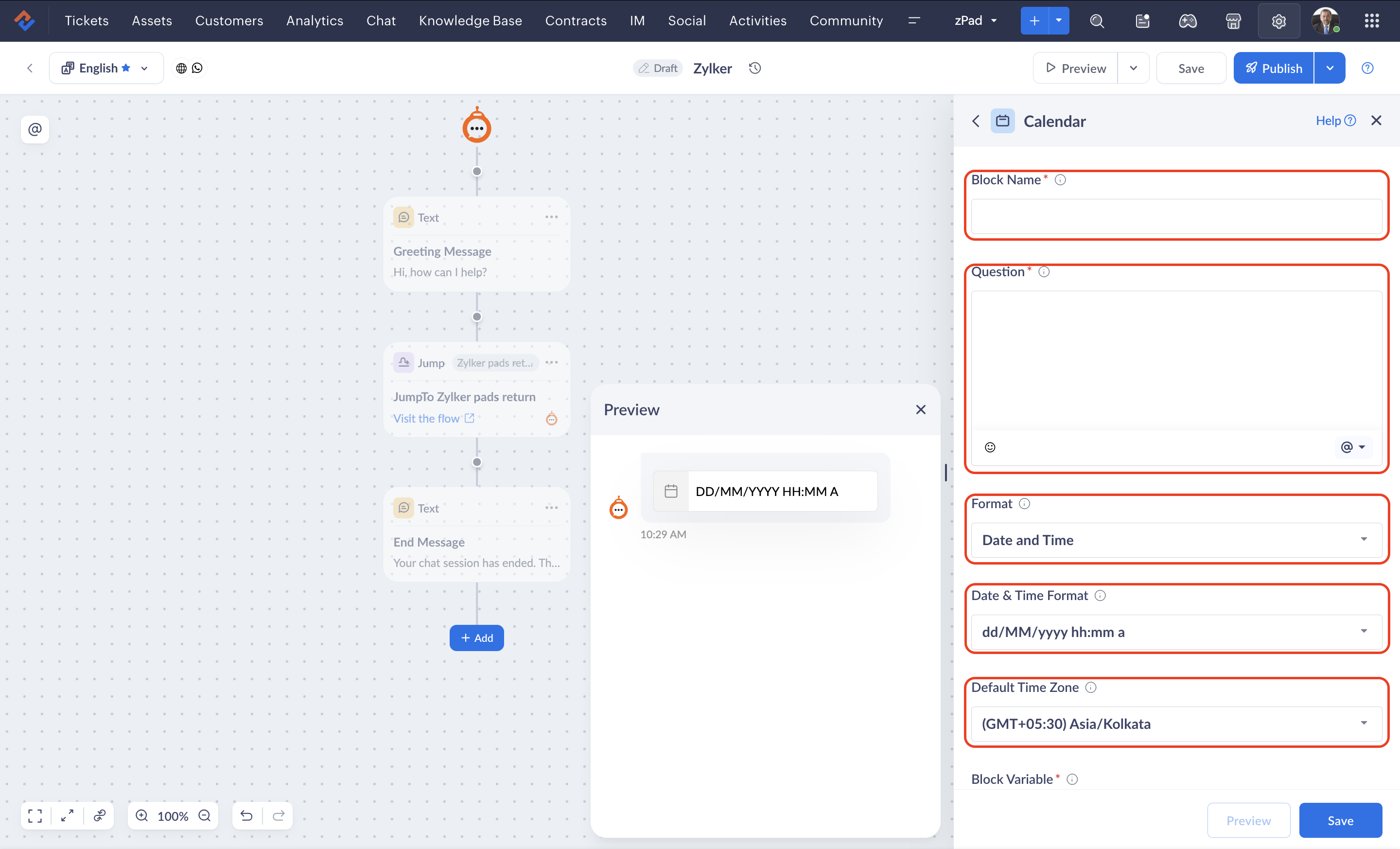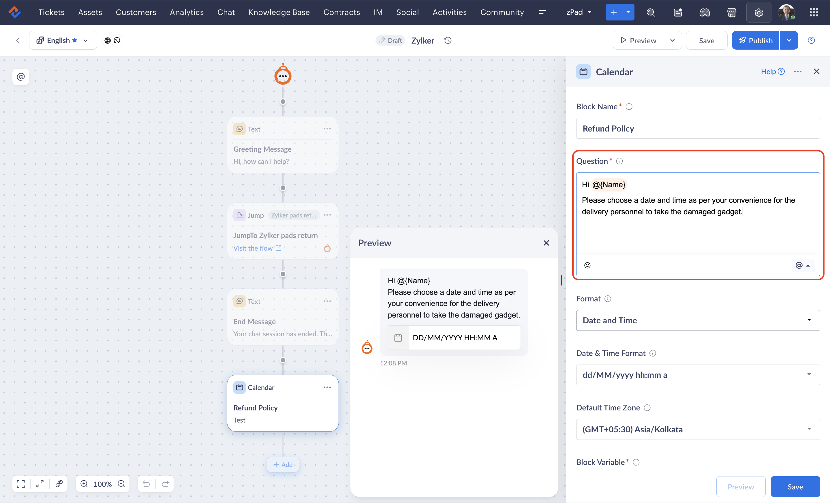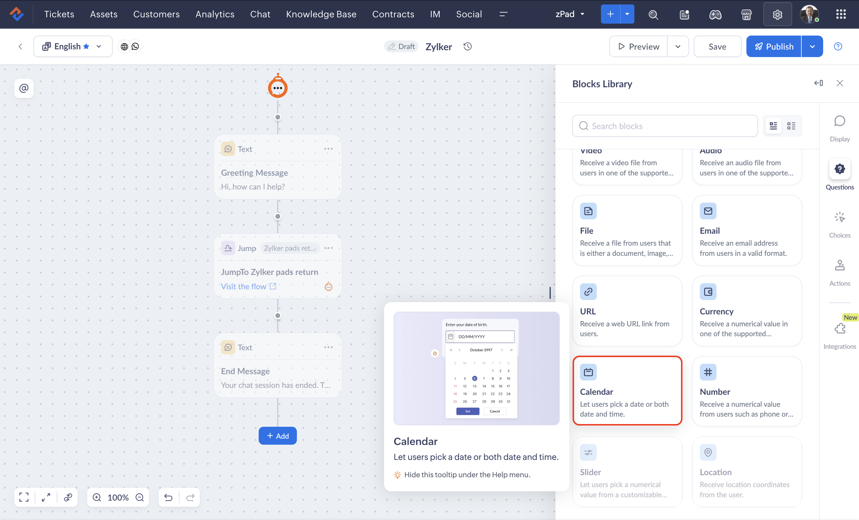 The calendar block allows you to prompt users for specific dates or date and time information within your chatbot interactions. For example, if you need to schedule a product delivery with a customer, the calendar block enables you to gather their preferred date and time.