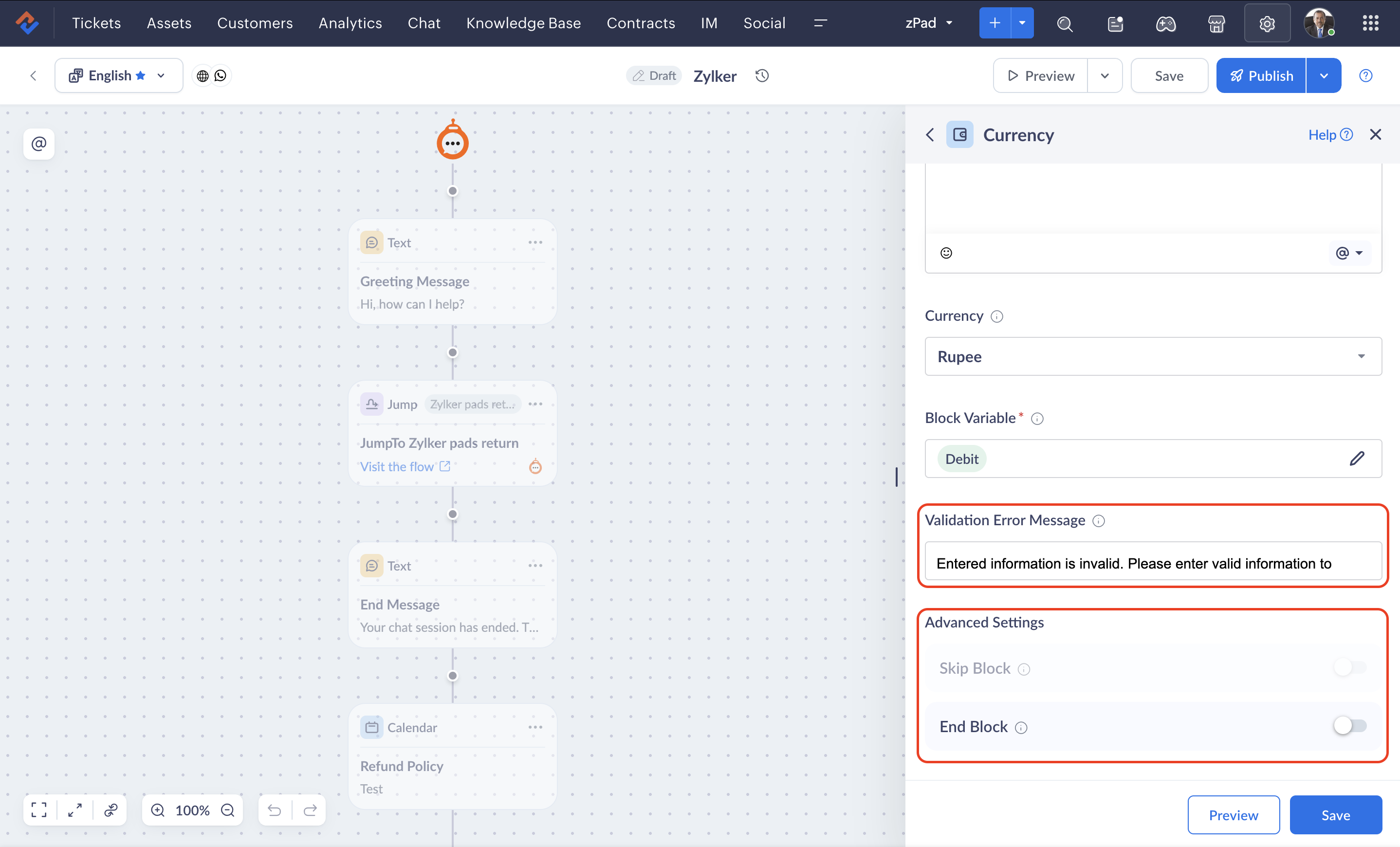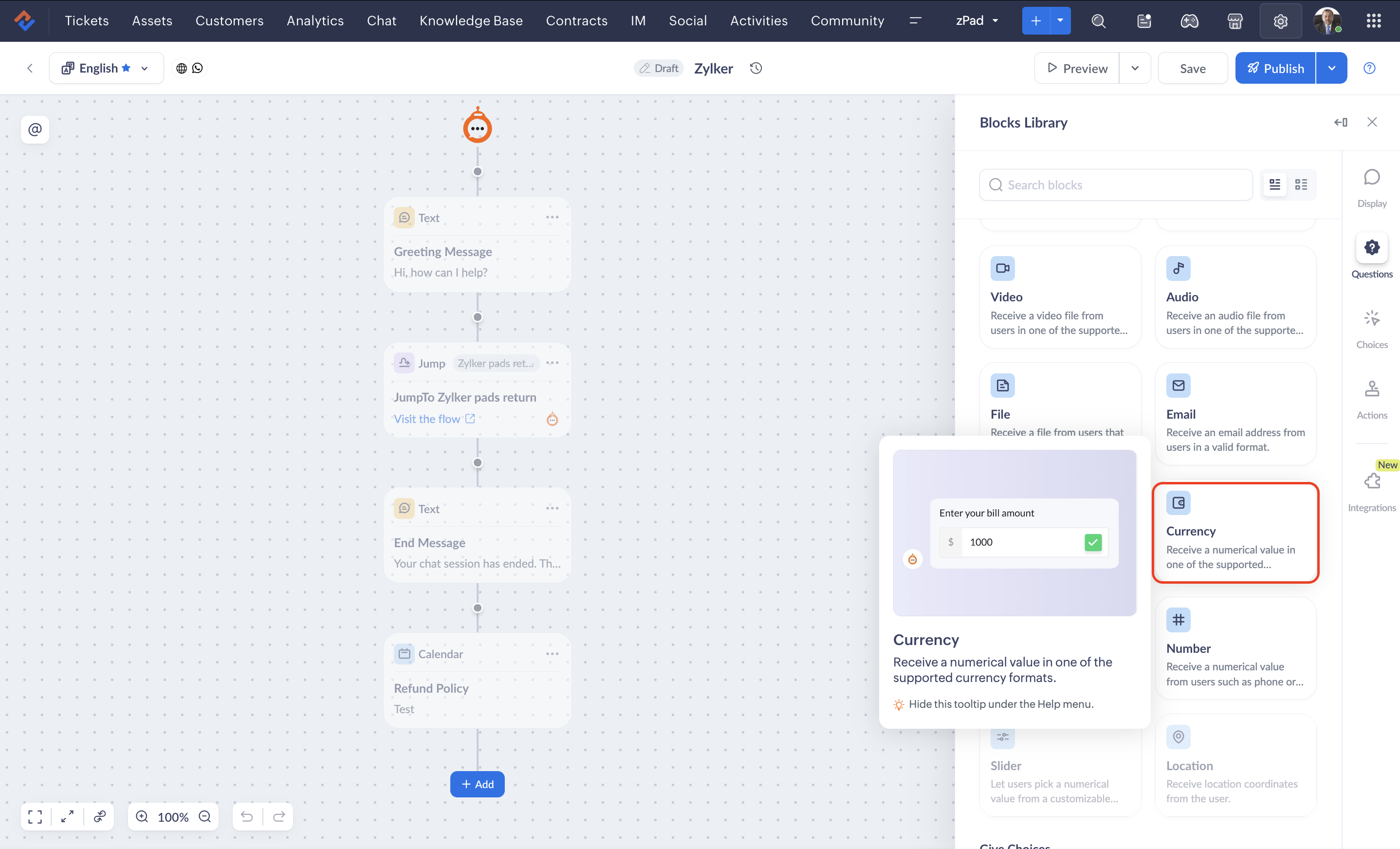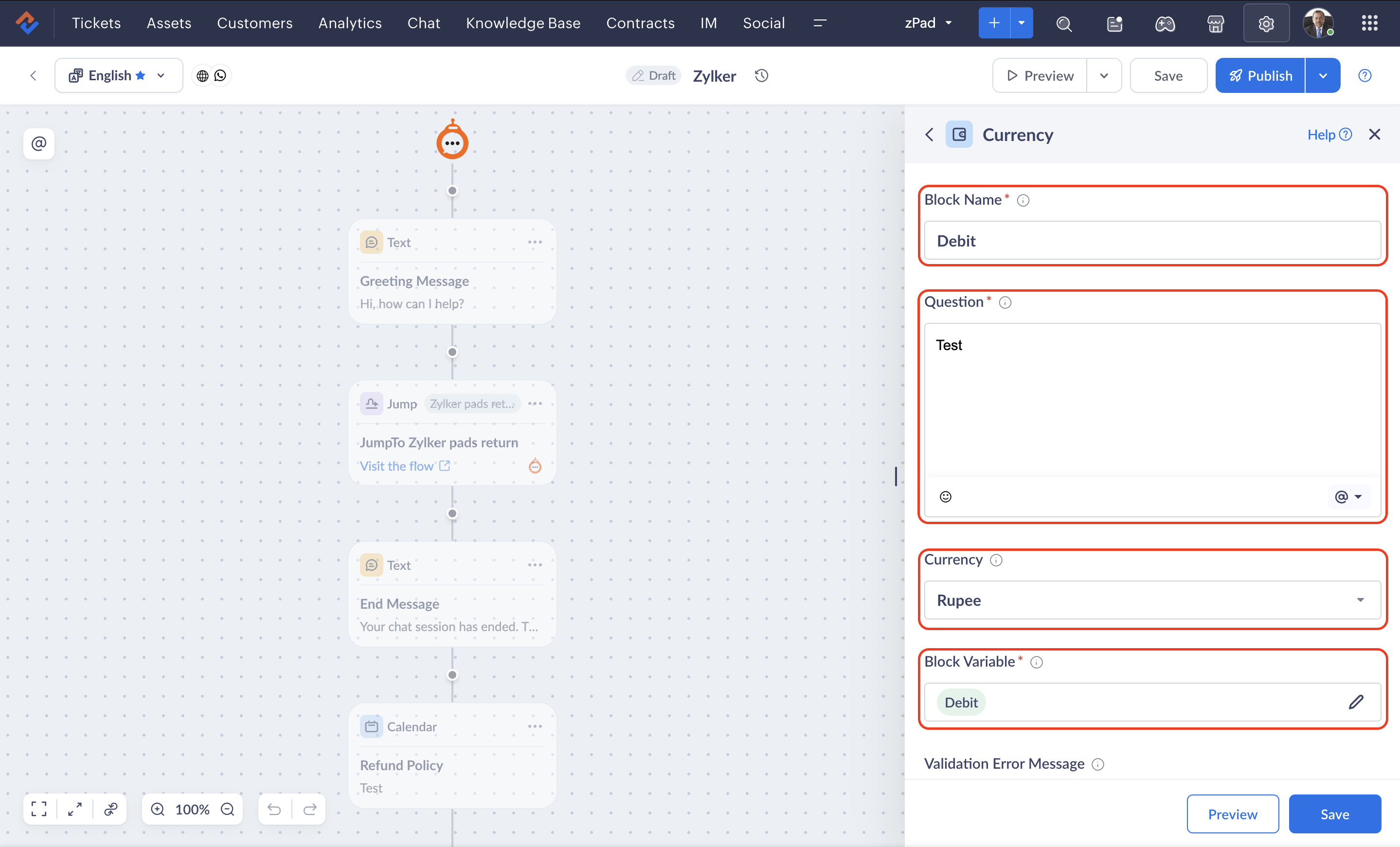 - If you delete a currency block while an end user is engaged in a live session with the bot, the previous version of the flow will be rendered until they restart the conversation.