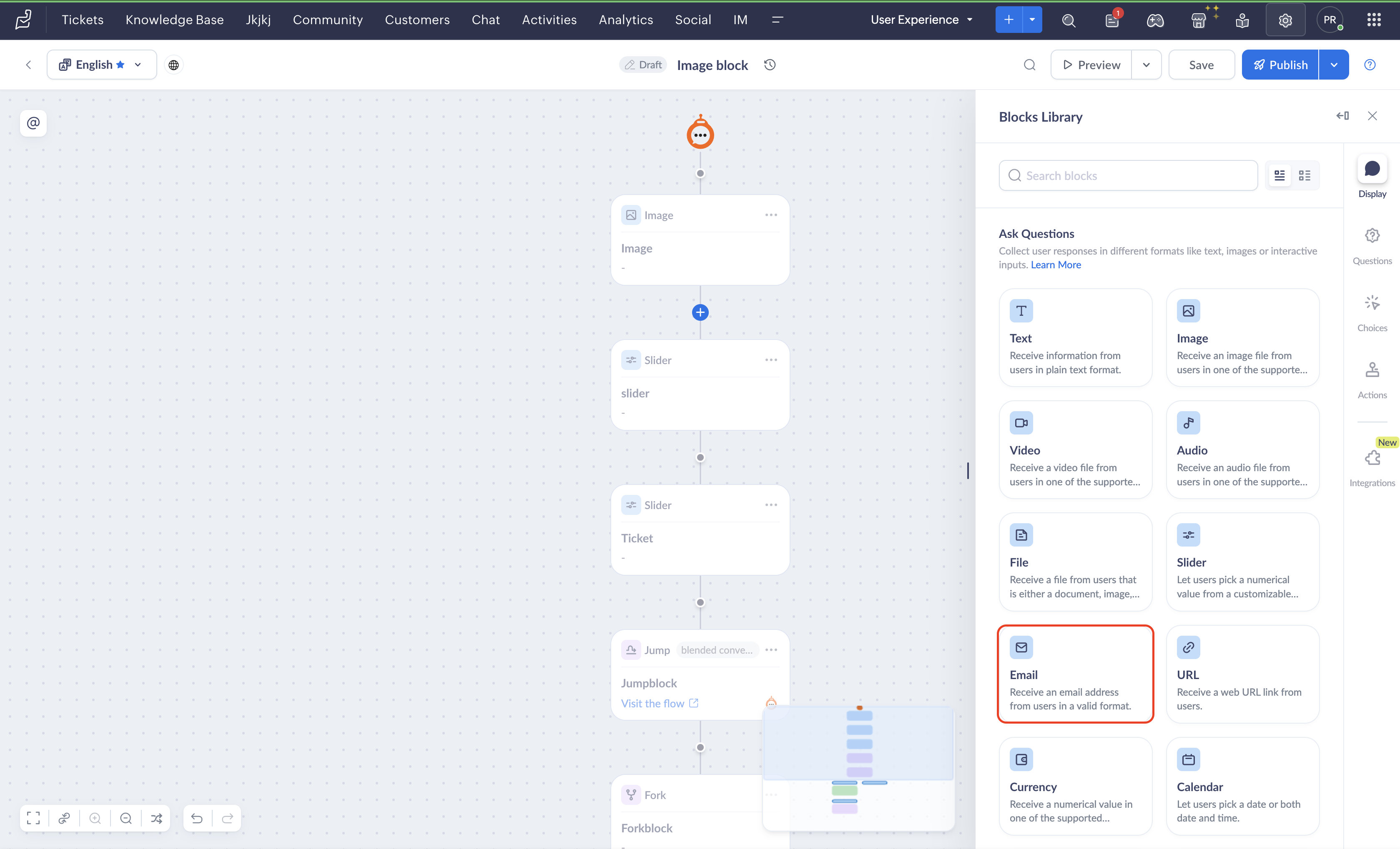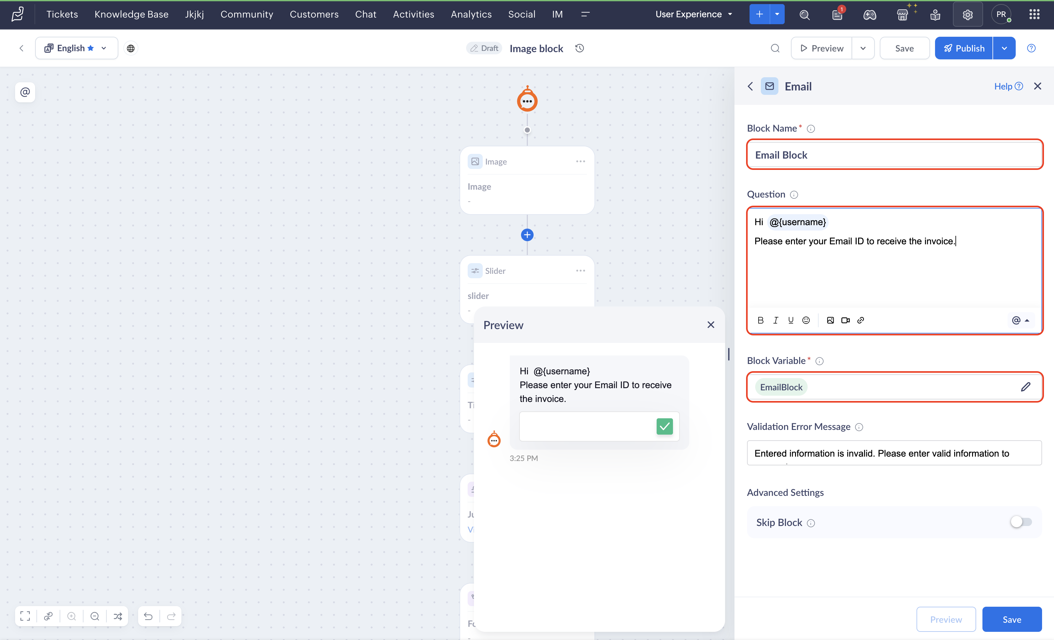 - If you delete a email block while an end user is engaged in a live session with the bot, the previous version of the flow will be rendered until they restart the conversation.
