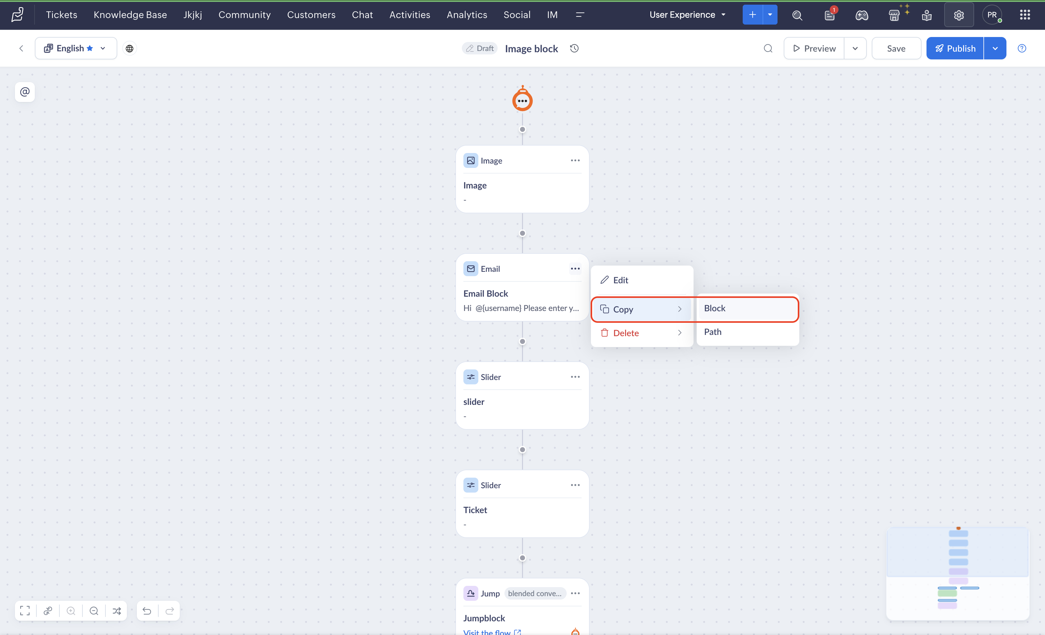 The copy block option can be used when you need to reuse a block that you previously created. You can copy that block and add it to your flow as is, or edit it according to the requirement.