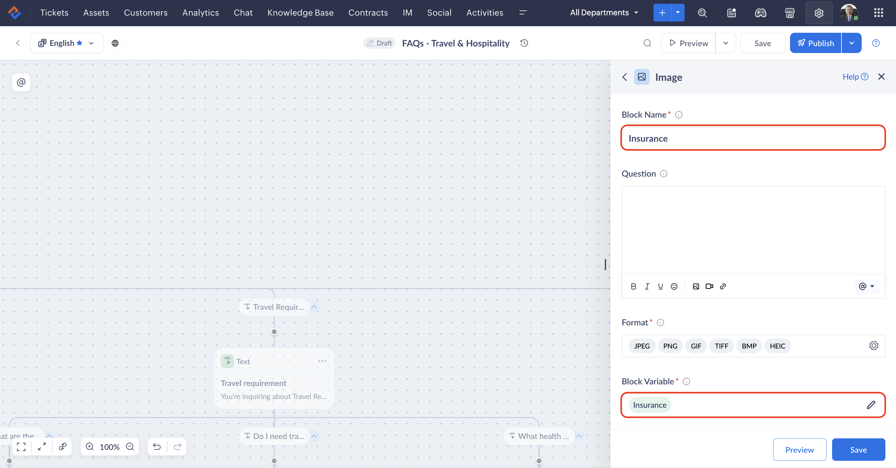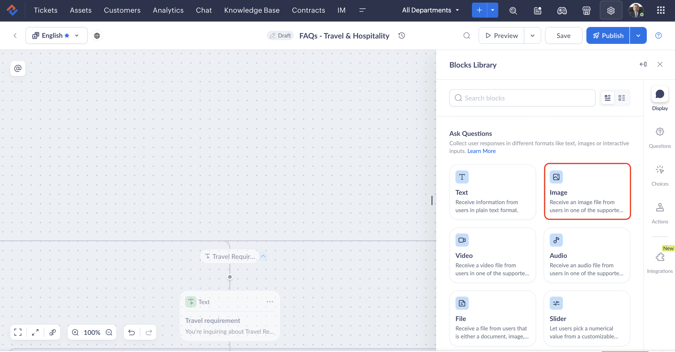 An image block allows you to ask questions and receive responses in the form of images, letting your bot handle scenarios requiring visual evidence.