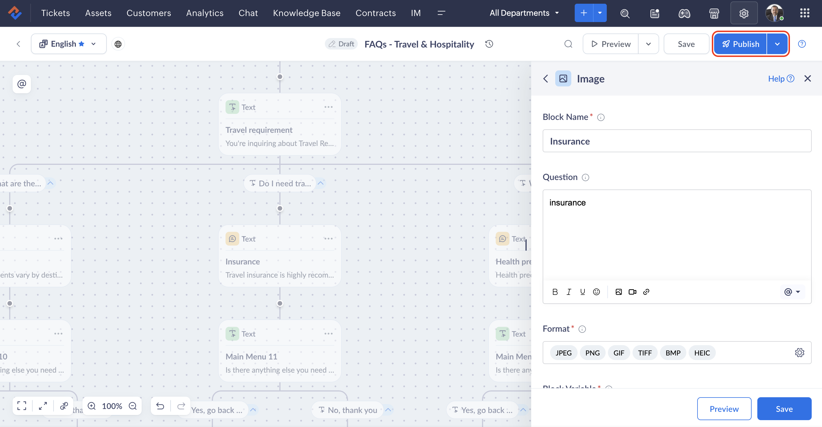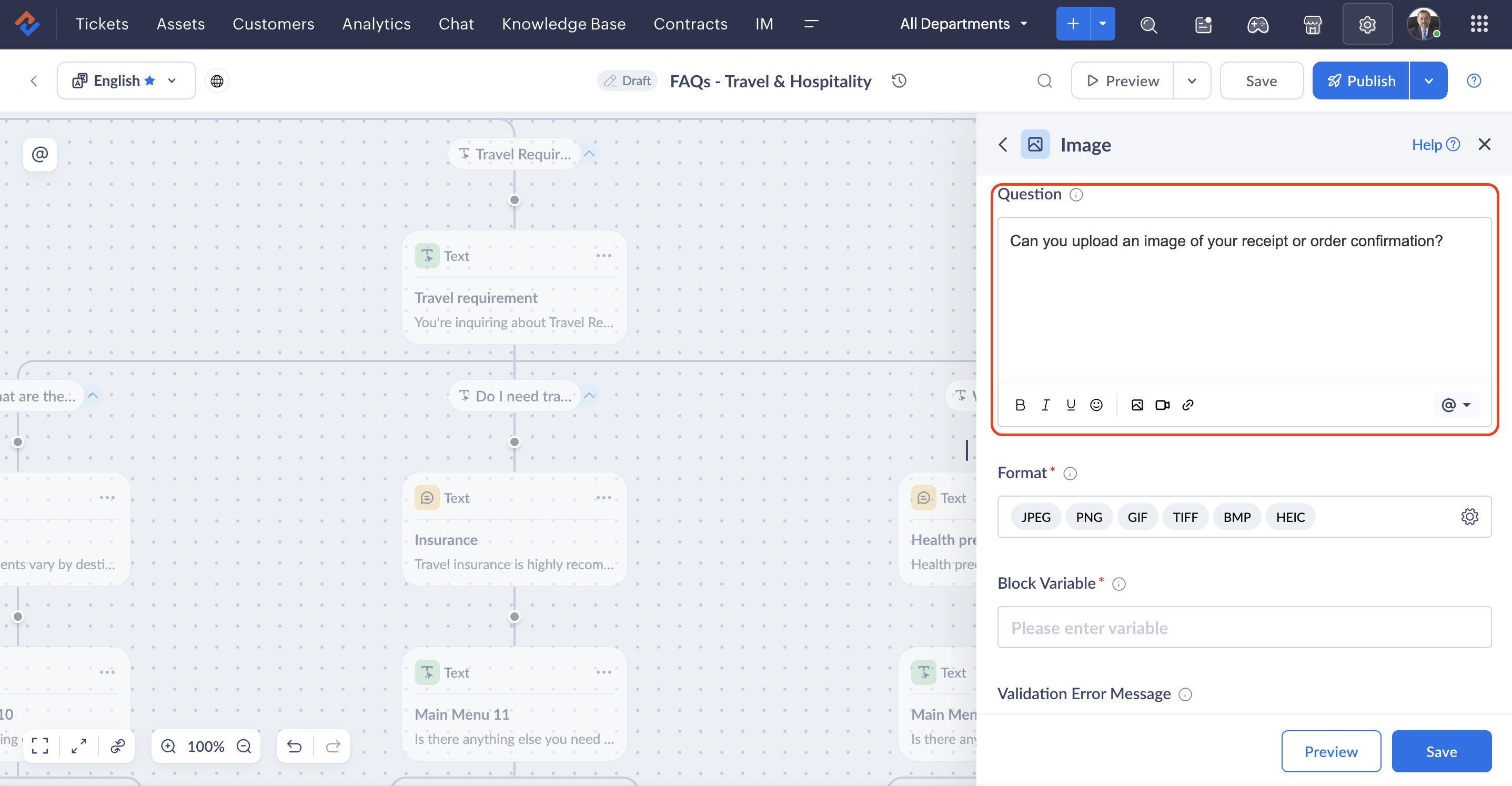 Incorporating an image block in the conversational flow makes it easy for customers to submit pictures directly through the chatbot interface. For example, if a user receives a damaged product, they can provide visual proof by uploading an image of the product.