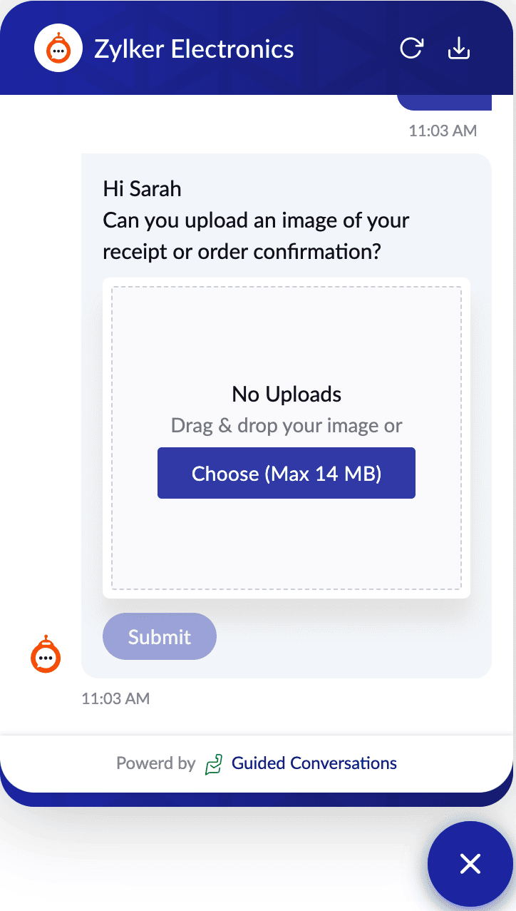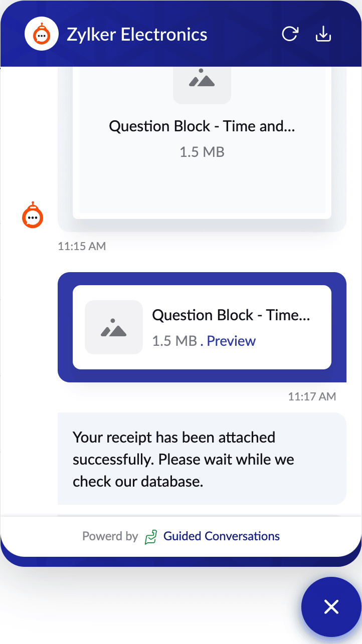 A customer from the online store Zylker Electronics received their order but encountered an issue. They immediately visited the website and started a conversation with the bot. During the interaction, the customer reported that the gadget they received was faulty. As the quality check process required visual proof of purchase to verify it matched their order details, the bot requested an image of the receipt. The customer attached the image of the invoice.