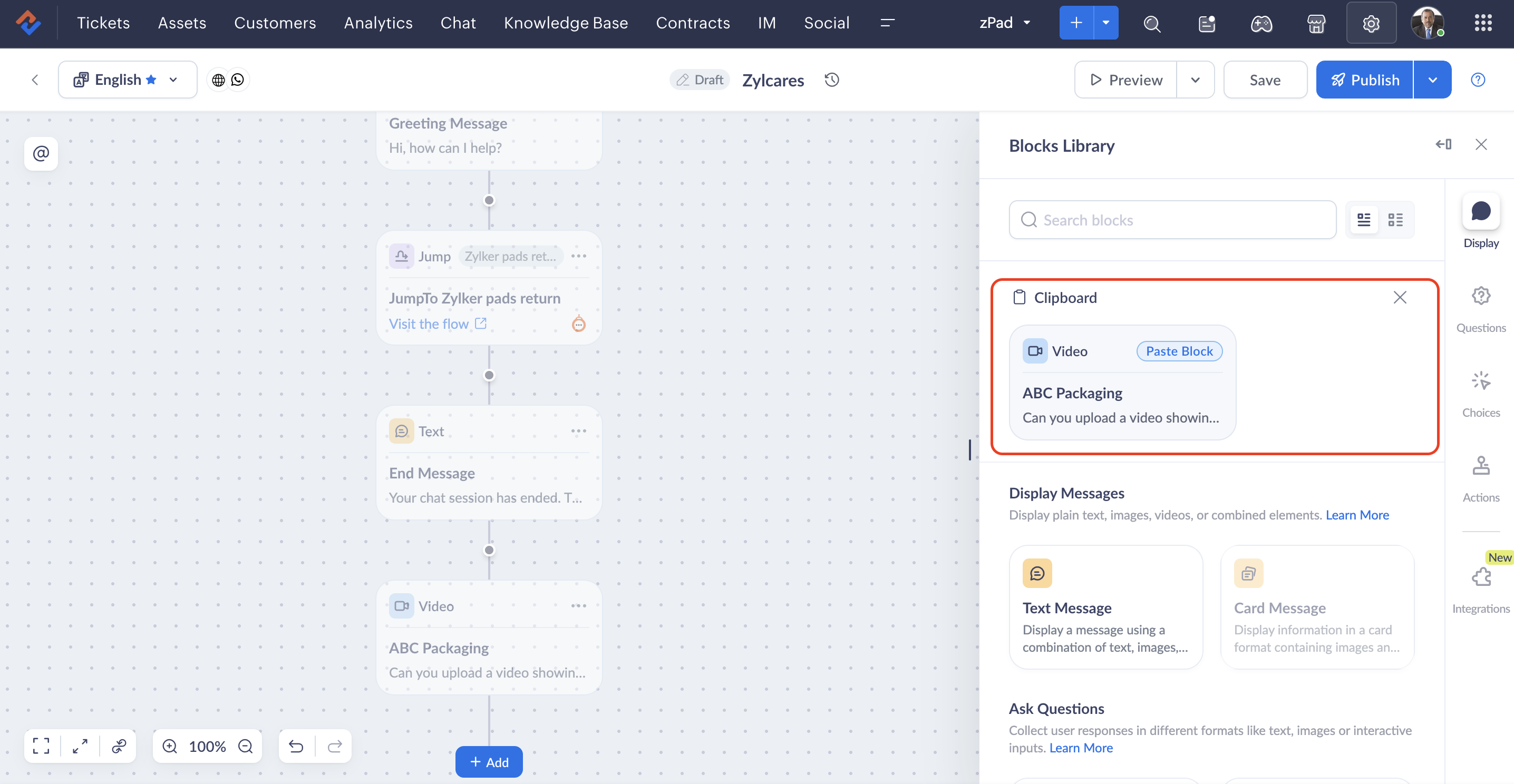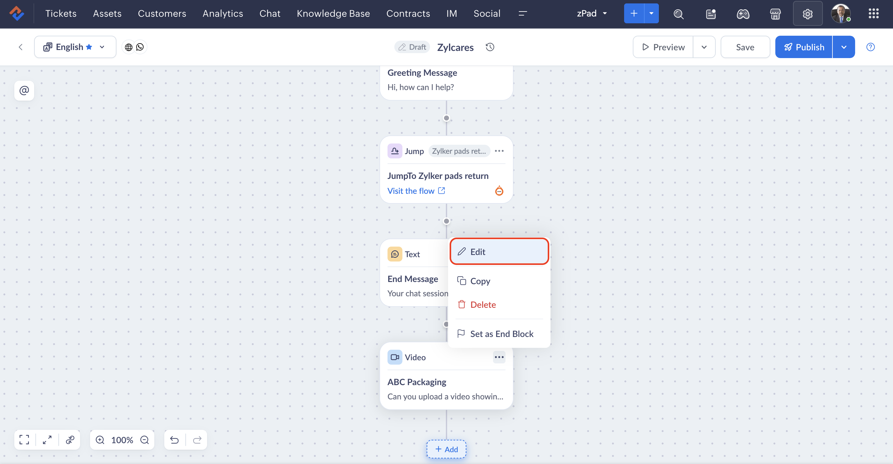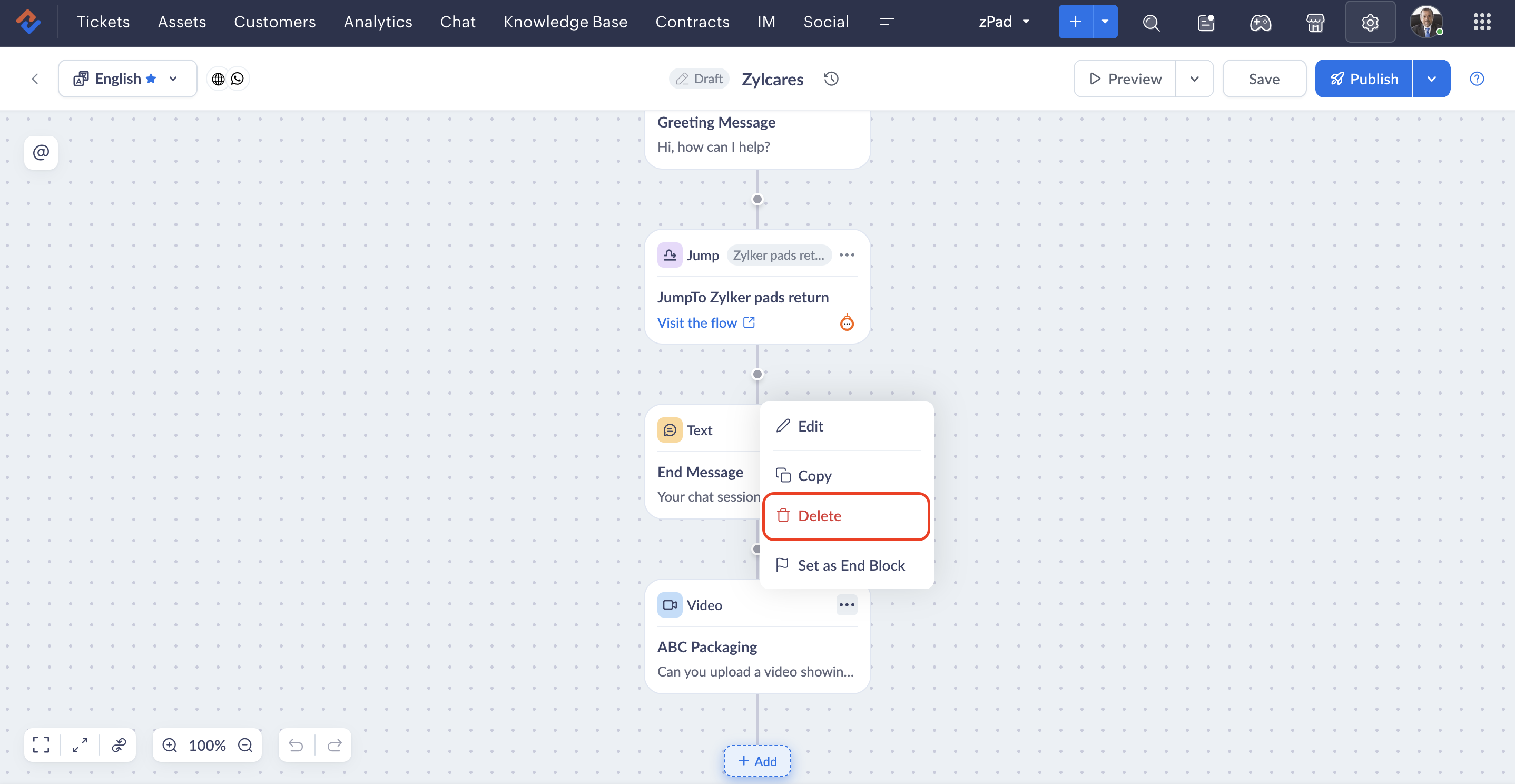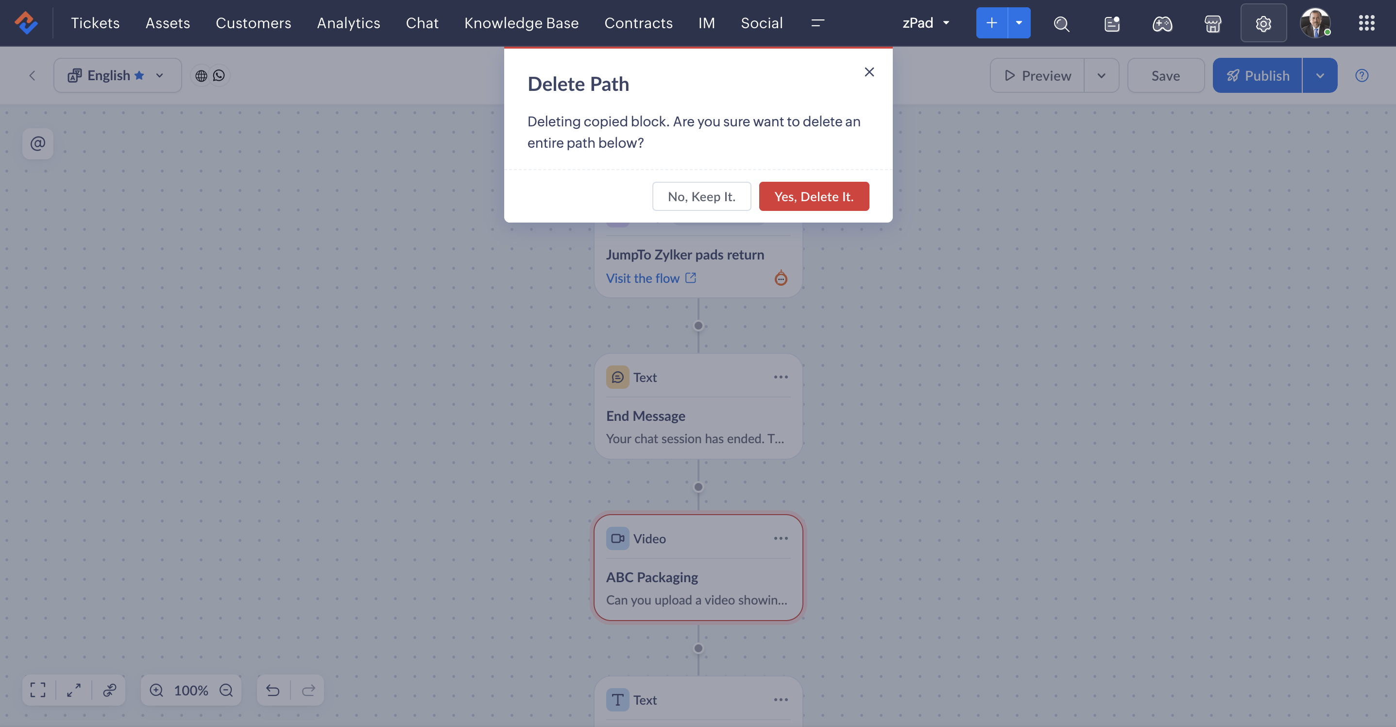 - If you delete a block while an end user is engaged in a live session with the bot, the previous version of the flow will be rendered until they restart the conversation.