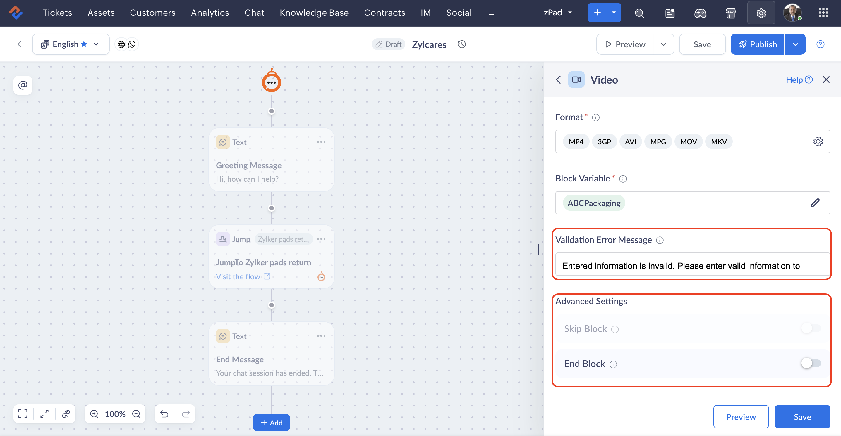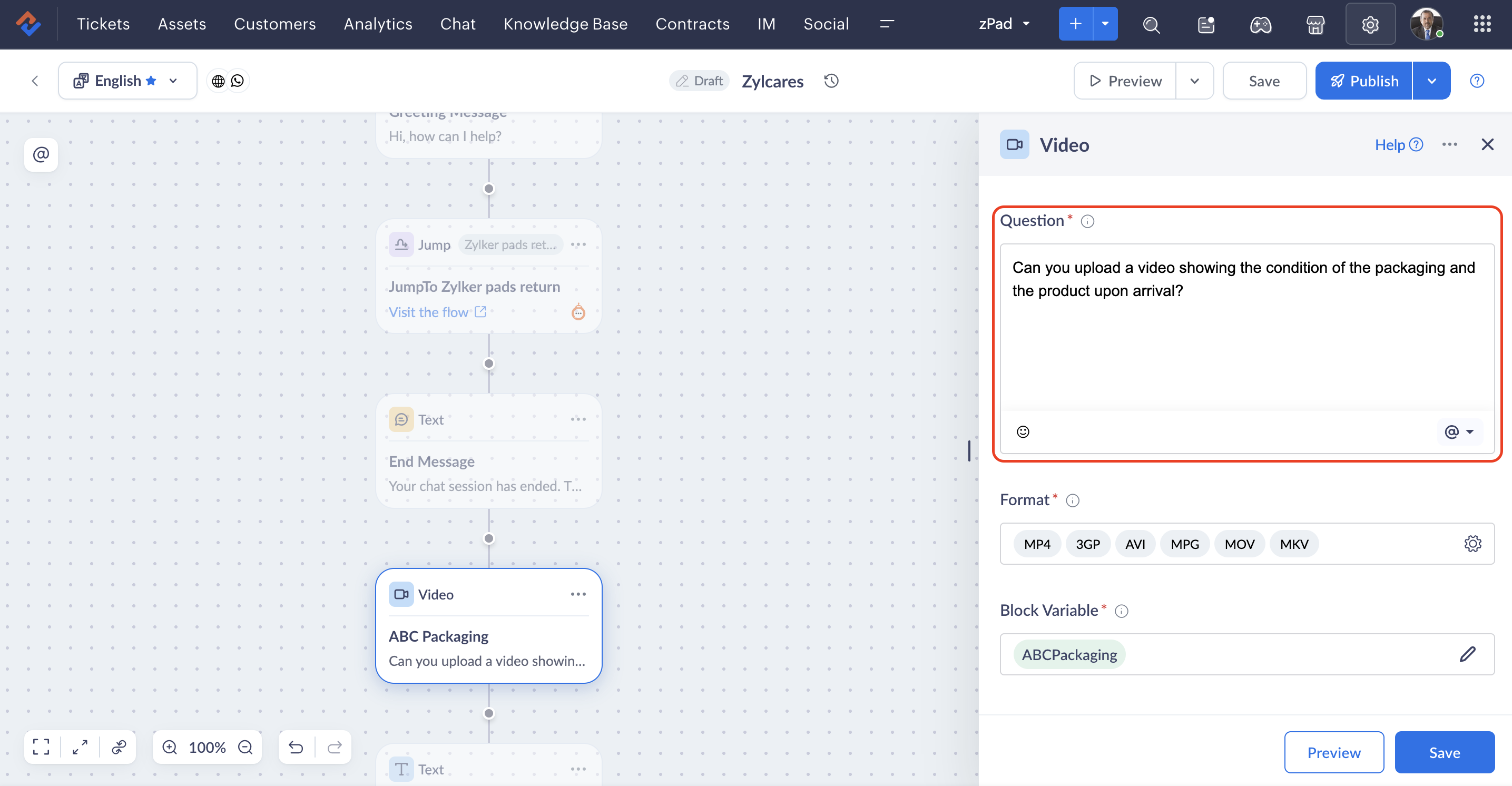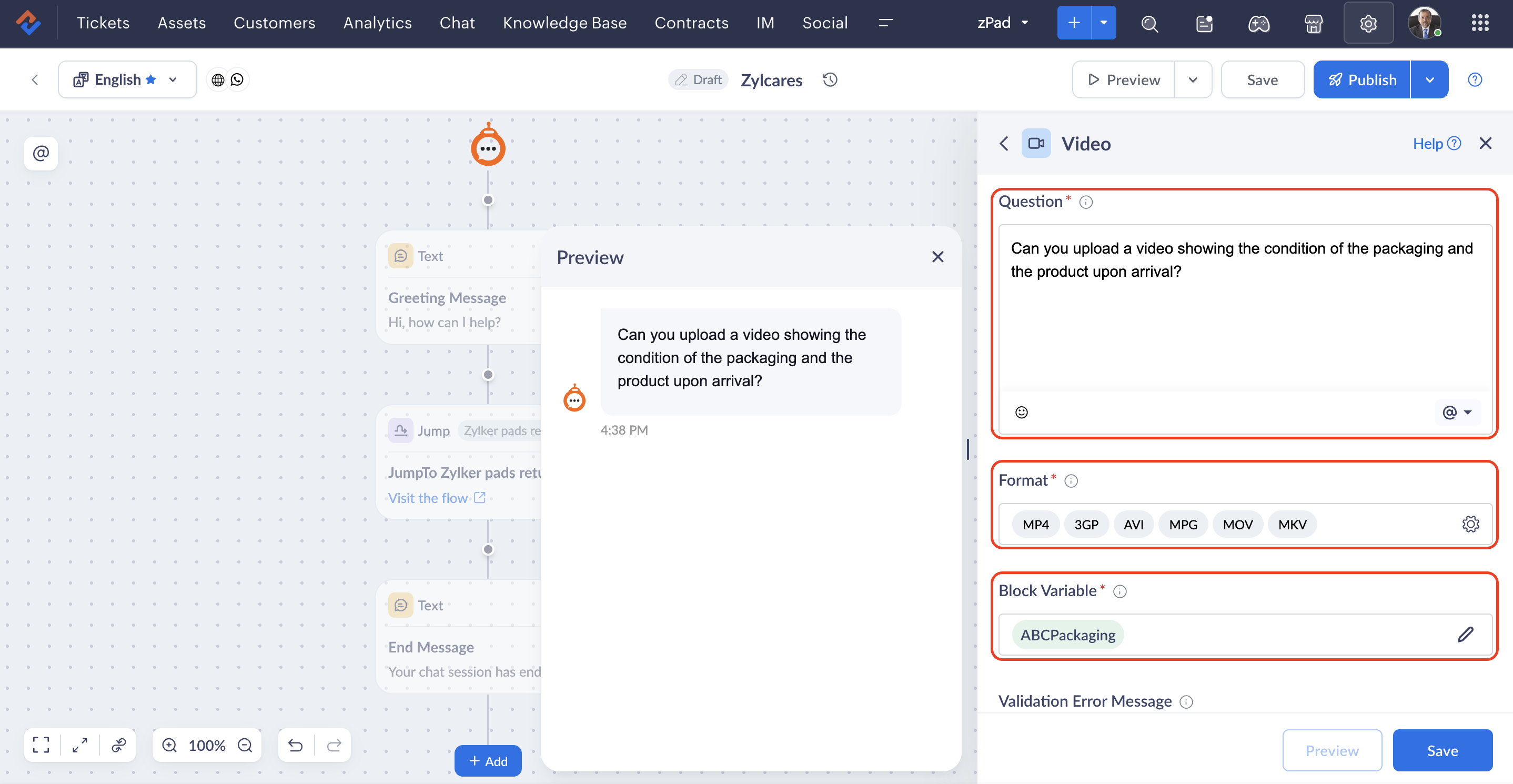 The video block ensures that the uploaded file is in an acceptable video format, providing a seamless and error-free experience for users. By incorporating this block, GC bot can handle complex user interactions that require more than just text-based communication. This also provides businesses with valuable visual data that can be used to enhance service quality and customer satisfaction.