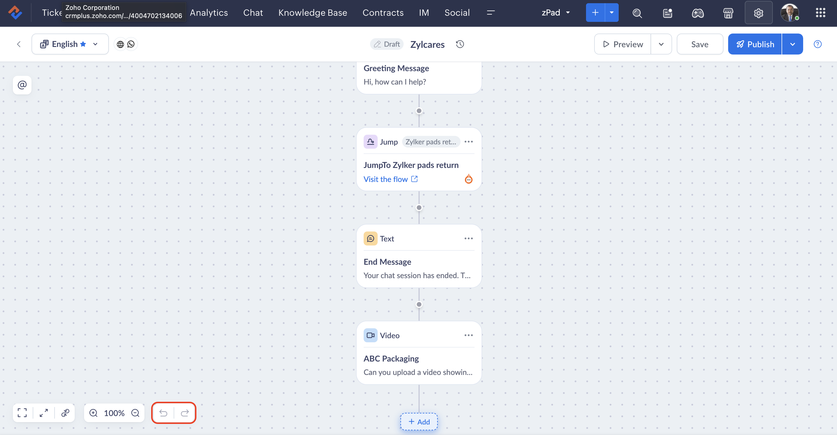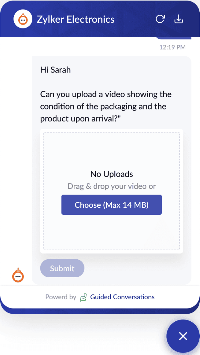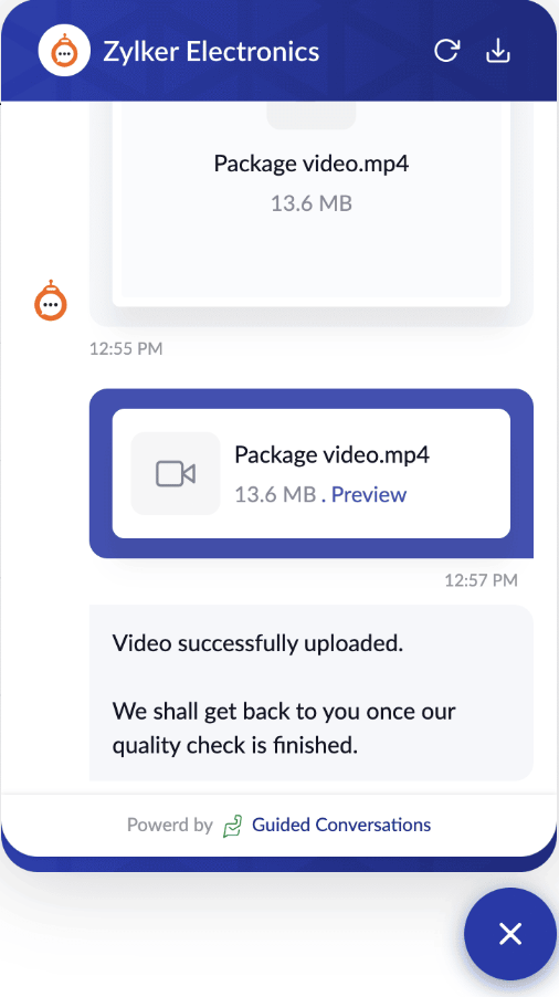 A customer from the online store Zylker Electronics received their order but encountered an issue. They immediately visited the website and started a conversation with the bot. During the interaction, the customer reported that both the packaging and the gadget were in poor condition. The bot then requested a video to show the condition of the packaging upon arrival. The customer responds by attaching the video and is awaiting the team's analysis to provide the customer with the right solution.