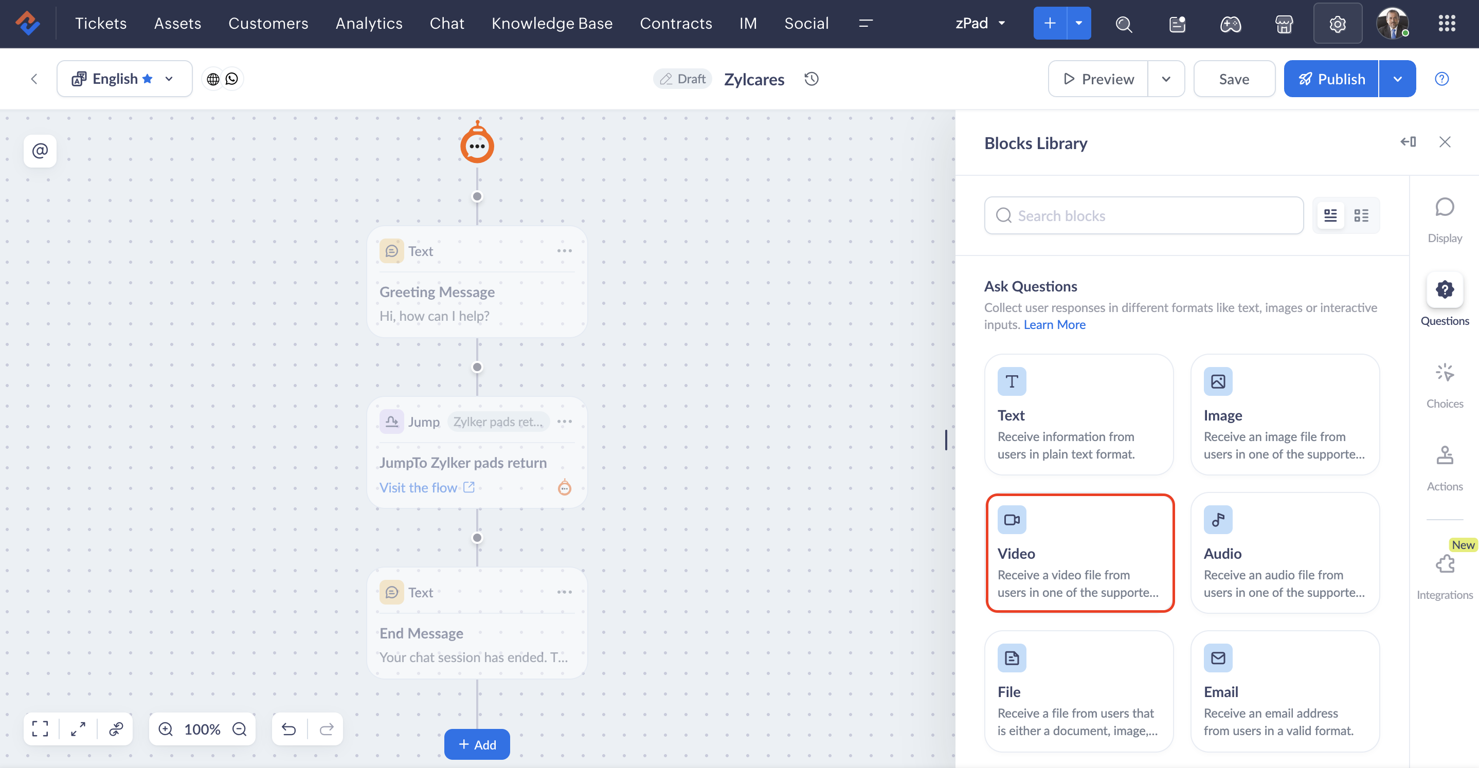 A video block allows the bot to request and receive responses in the form of video files from users. This block enhances the interaction by enabling users to provide detailed visual information, which can be particularly useful in various scenarios.