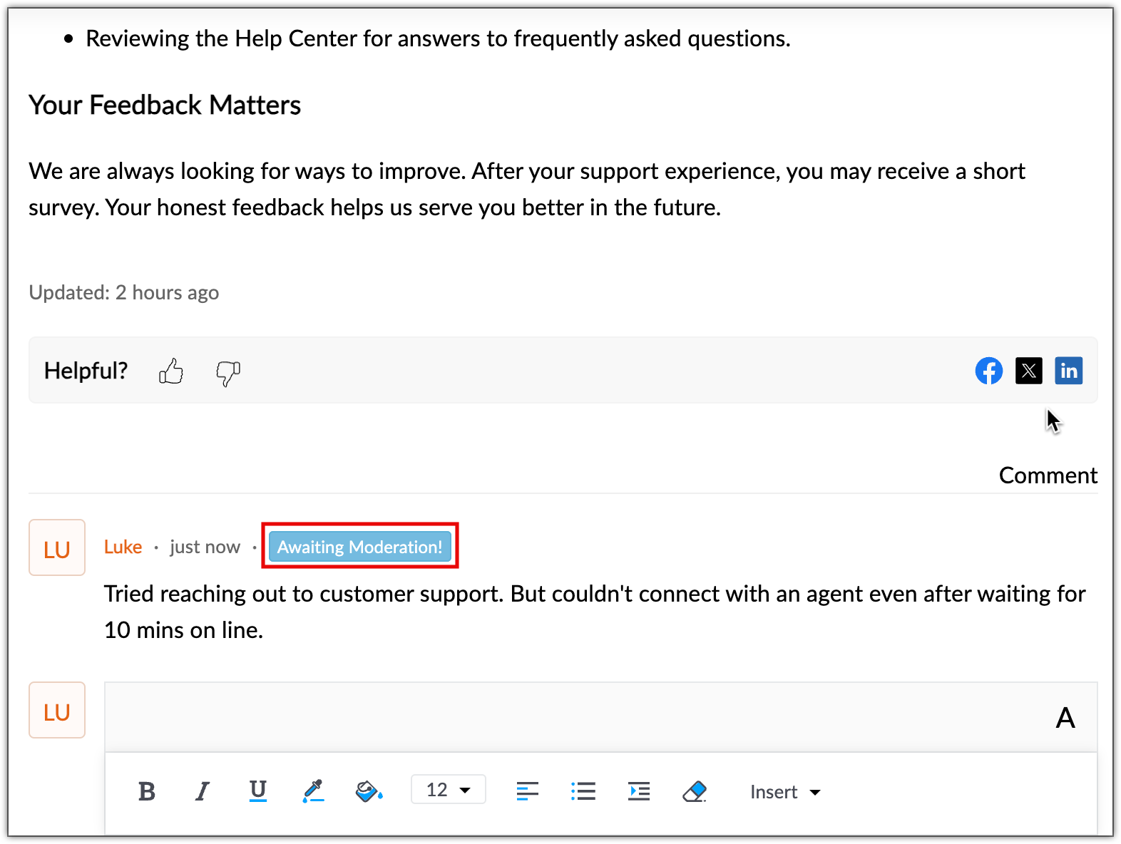 A customer can log into the Help Center and leave a comment on an article that is published in the KB. By default, comments posted by customers are public. From the comment box, customers can: