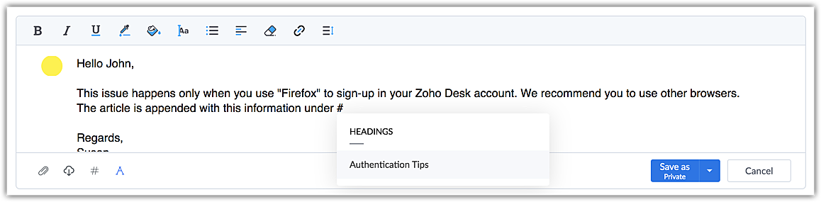 In a comment, agents can use the # key to select a heading and highlight it to provide better context to customers. For example, agents can note that browser details are available under #Authentication Tips. Agents can click on the Authentication Tips heading to access the necessary article using ASAP for easy reference.