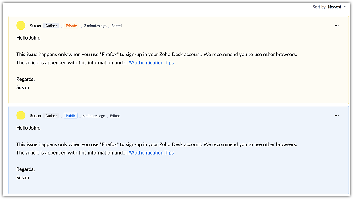 Agents can post private or public comments from the Agent Interface. Private comments can be used for internal reference and will not be displayed in the Help Center. For better distinction, private comments appear with a yellow background, while public comments appear with a blue background. By default, comments are set to private, but can be made public as needed.