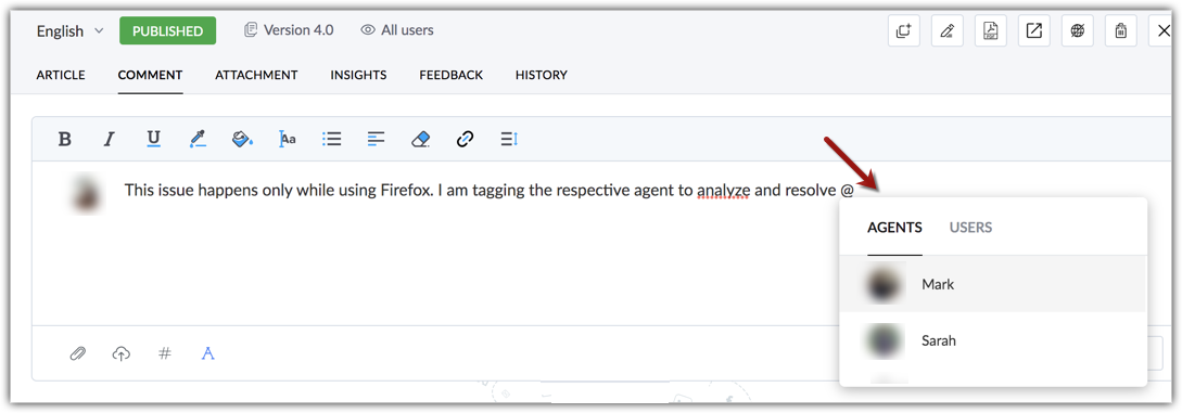 Agents can tag other agents, customers/users, and groups in a comment. Only agents, users, or groups that are associated with a department can be tagged. An email notification will be sent to the article owner whenever a customer or an agent leaves a comment. Notifications will be sent for both public and private comments regardless of whether the user is mentioned or tagged in it.