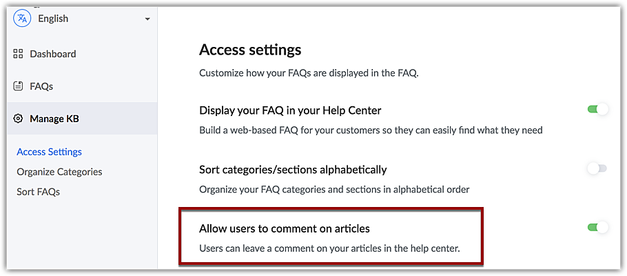 - Select Manage KB > Access Settings from the left panel.