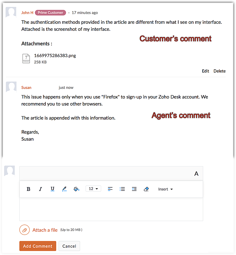 Customers and agents can view all comments posted on an article. Customers can edit or delete their comments. In every comment, the customer's label (their identification or grouping created in Zoho Desk) will be displayed for distinction and better identification.