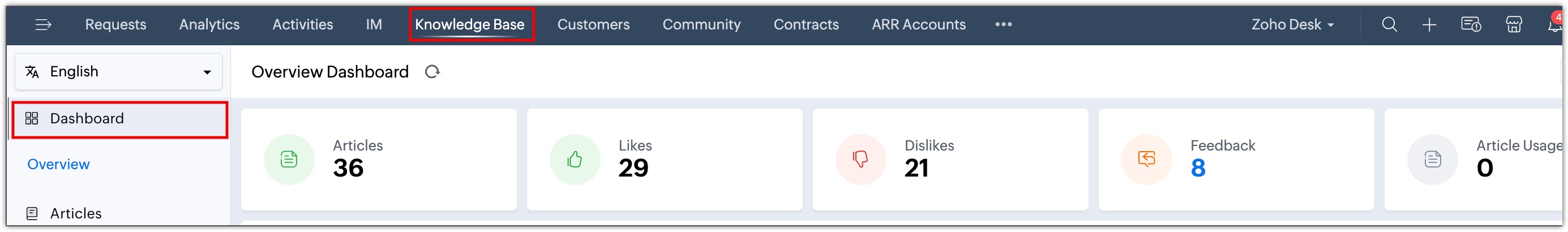 The knowledge base dashboard provides a visual representation of essential insights about published articles. This allows writers or content creators to track the article's performance and popularity over time. Metrics such as article count, number of likes and dislikes, feedback, and comments can help identify gaps and areas for improvement.