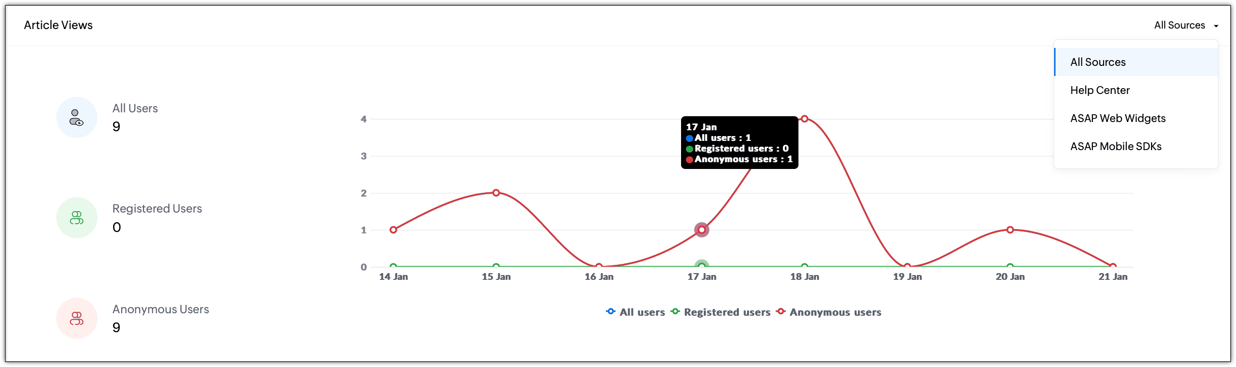 By default, the line graph shows the number of views received across the help center, ASAP web widgets, and ASAP Mobile SDKs. You can filter and see the number of views in each channel to compare which channel got the most interaction and enhance engagement in that channel.