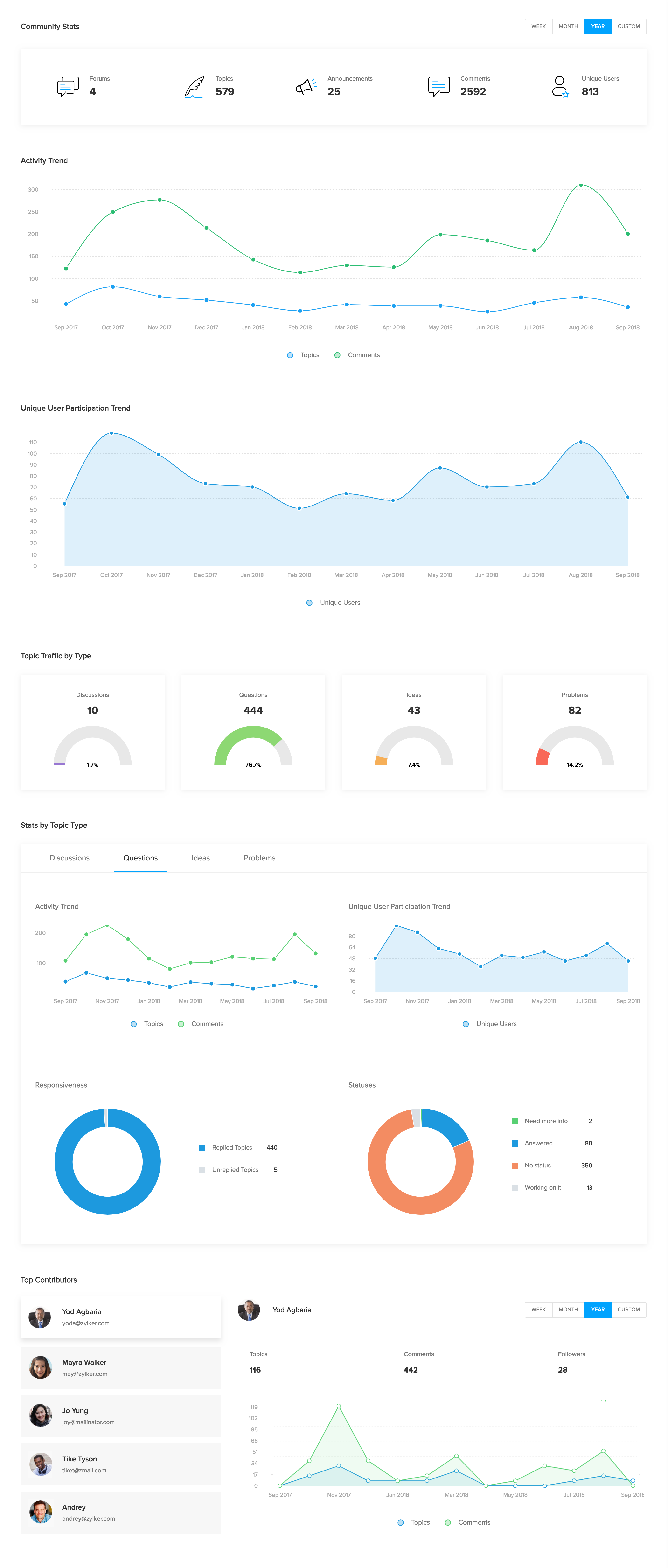 • Stats by Topic Type: This section displays data about specific topic types in your community. You can easily switch from one topic type to another using the tabs. This section includes the following charts: