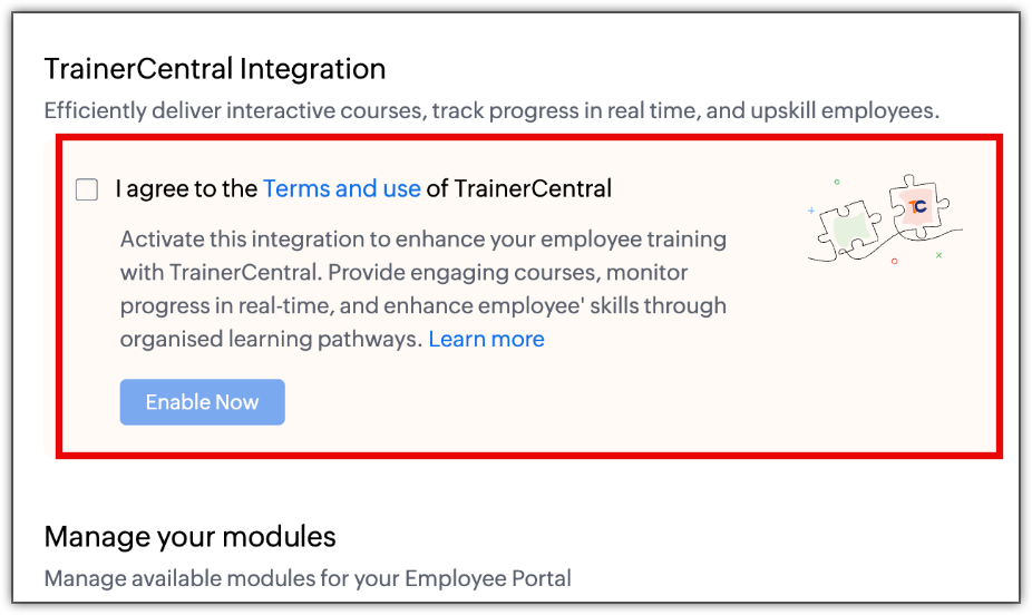 Select the I agree to the Terms and use of TrainerCentral checkbox to provide consent to enable the integration.
