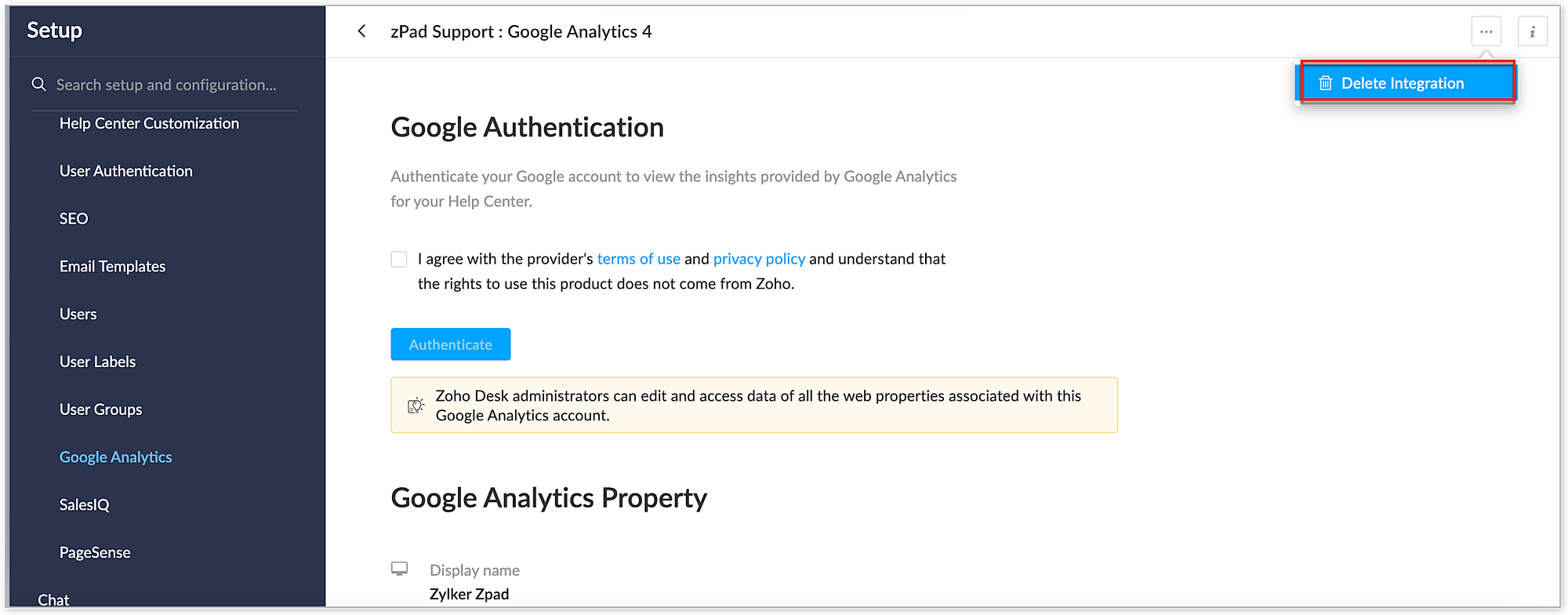 Upon deleting the Google Analytics 4 integration, you will no longer be able to track analytics for your Help Center within the Zoho Desk platform. However, you will still have access to your past metrics data through your Google Analytics account, allowing you to view and analyze the historical data.