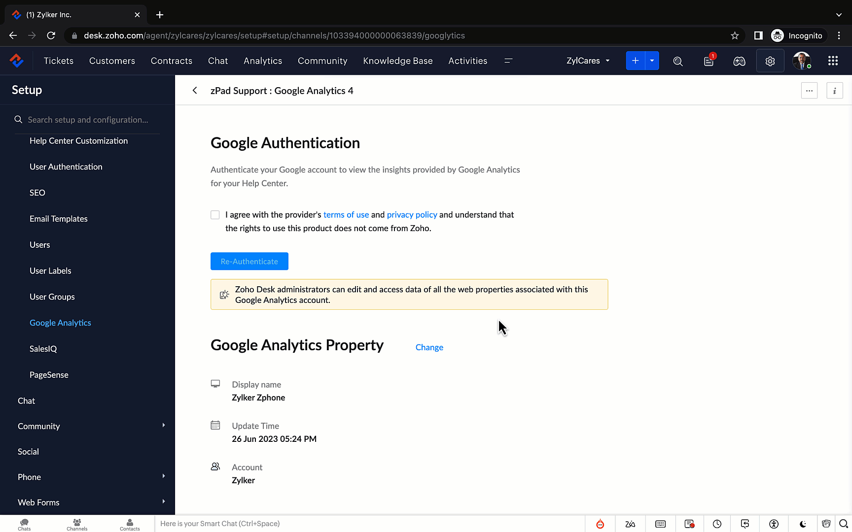 1) Users with Administrative profile permission can integrate Google Analytics 4 in Zoho Desk.