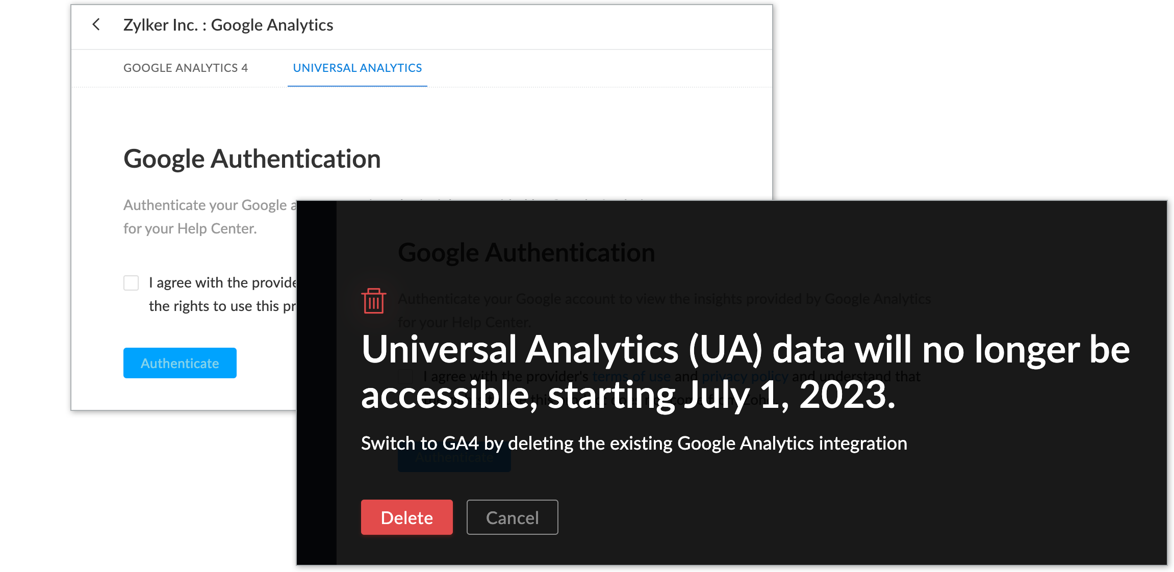 Universal Analytics was sunset on July 1, 2023. Google Analytics 4 is now supported in Zoho Desk. We request all users to switch to GA4 and delete the Universal Analytics integration with Zoho Desk. Please note that the past metric obtained from UA will not be deleted and can still be accessed from your respective Universal Analytics account.