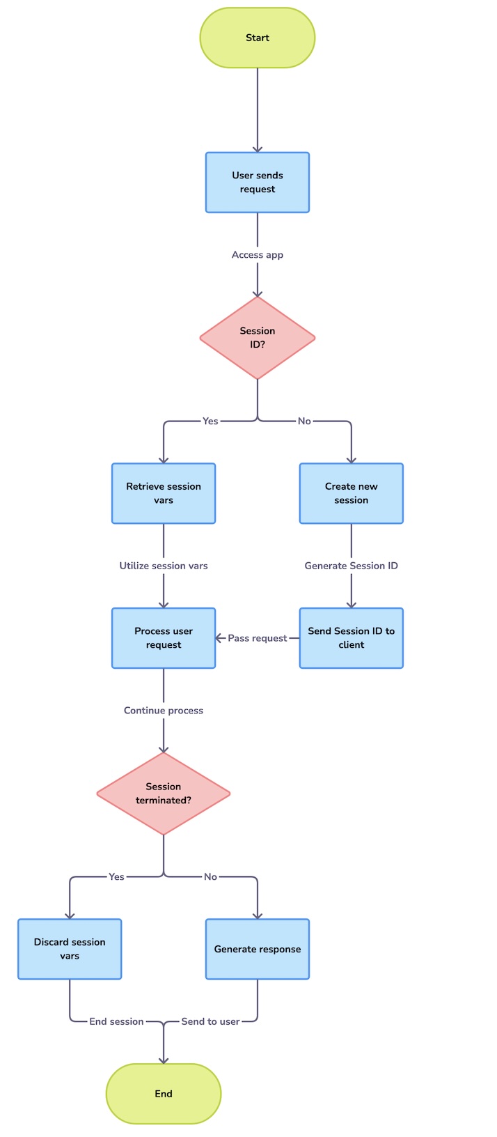 As the user interacts with the application, specific information (e.g., username, preferences) is stored in session variables on the server, associated with the user’s Session ID.