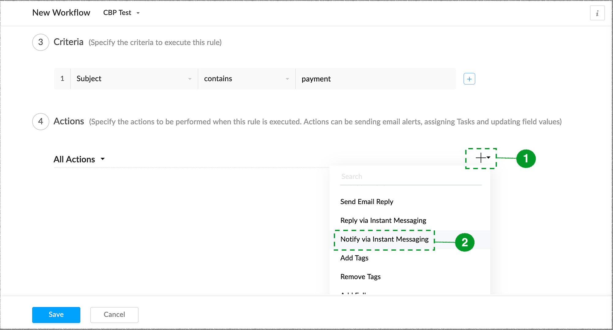 7. In the Actions section, click the Add icon and select Notify via Instant Messaging from the drop-down list.