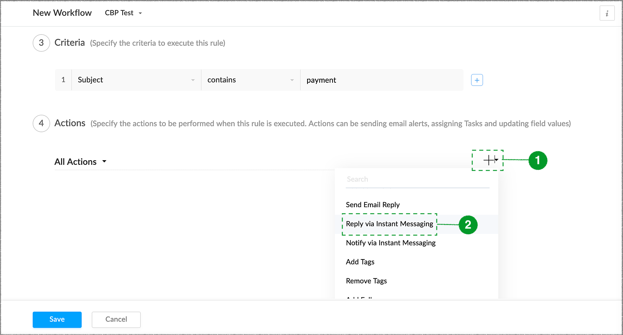7. In the Actions section, click the Add icon and select Reply via Instant Messaging from the drop-down list.