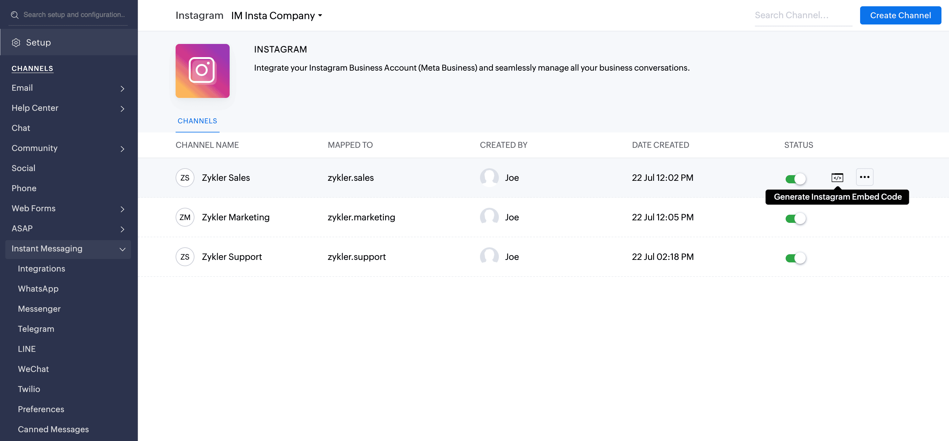 To start with the set up of the message button feature, navigate to the settings bar and select Instant Messaging -> Instagram Channel -> Click on Configure and select the channel that you wish to set up the embeddable button for and click on Generate Instagram Embed Code by hovering over the desired channel.