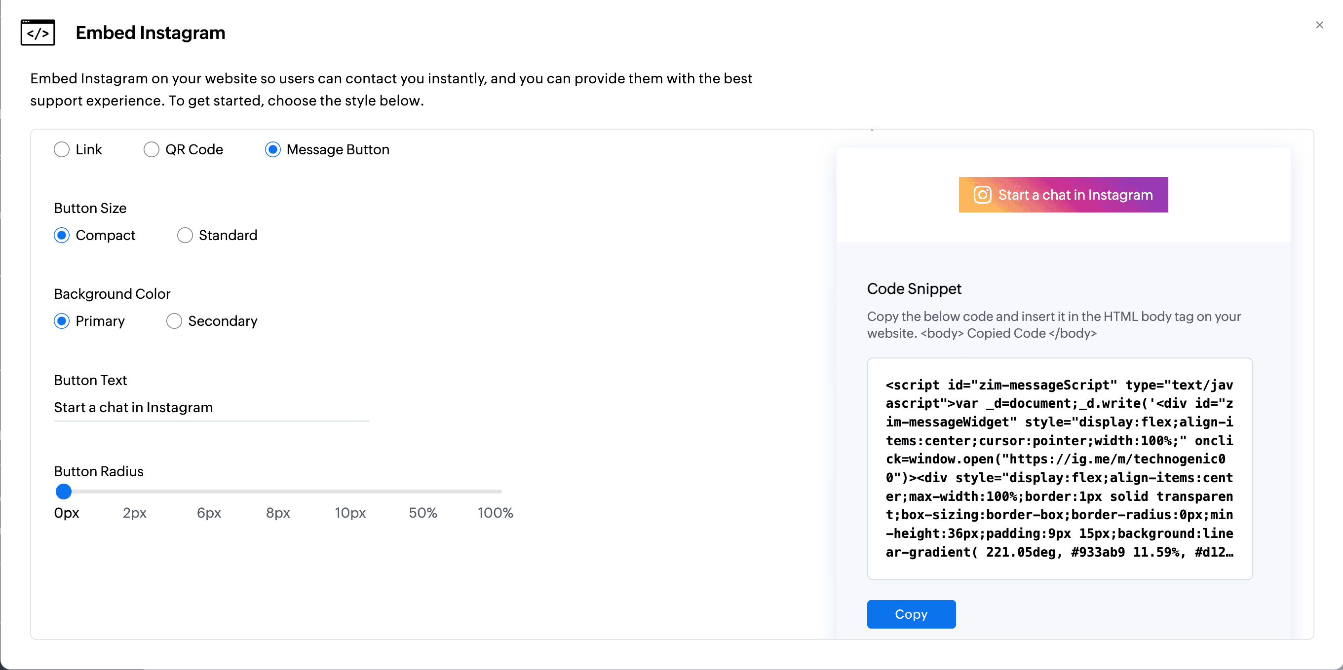 Finally, on the right hand side, you can see the customized Message Button Preview. You can then review and copy the generated code snippet.