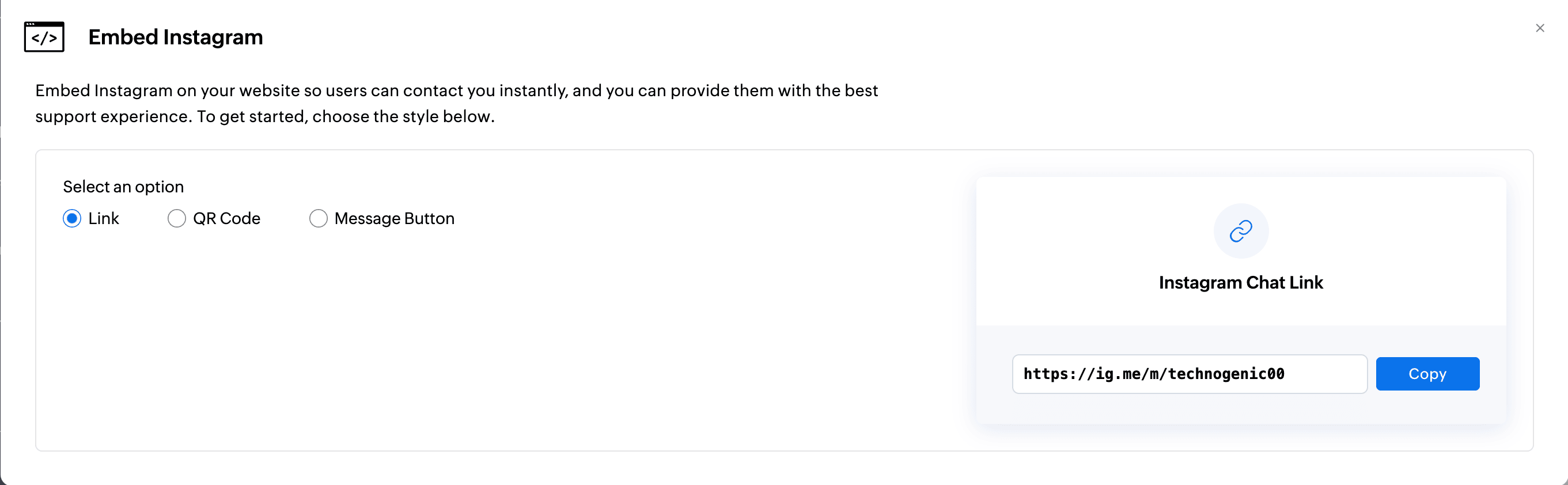 The chat link feature lets customers to copy an auto-generated chat link (Reference Link) and paste this on your website and instantly start chatting with businesses through the Instagram messaging app.