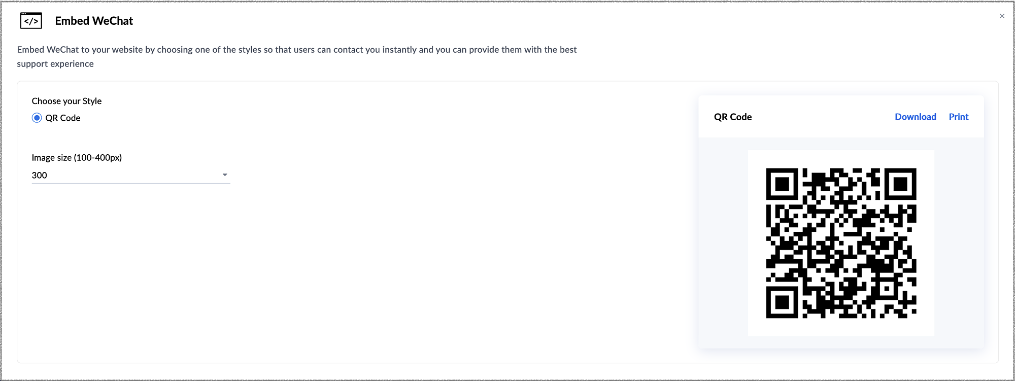 You can also start chatting by downloading the auto-generated QR code. Download the code and copy-paste it on your website or display it at the store (physical outlet) for customers to quickly scan and reach out through the WeChat app.