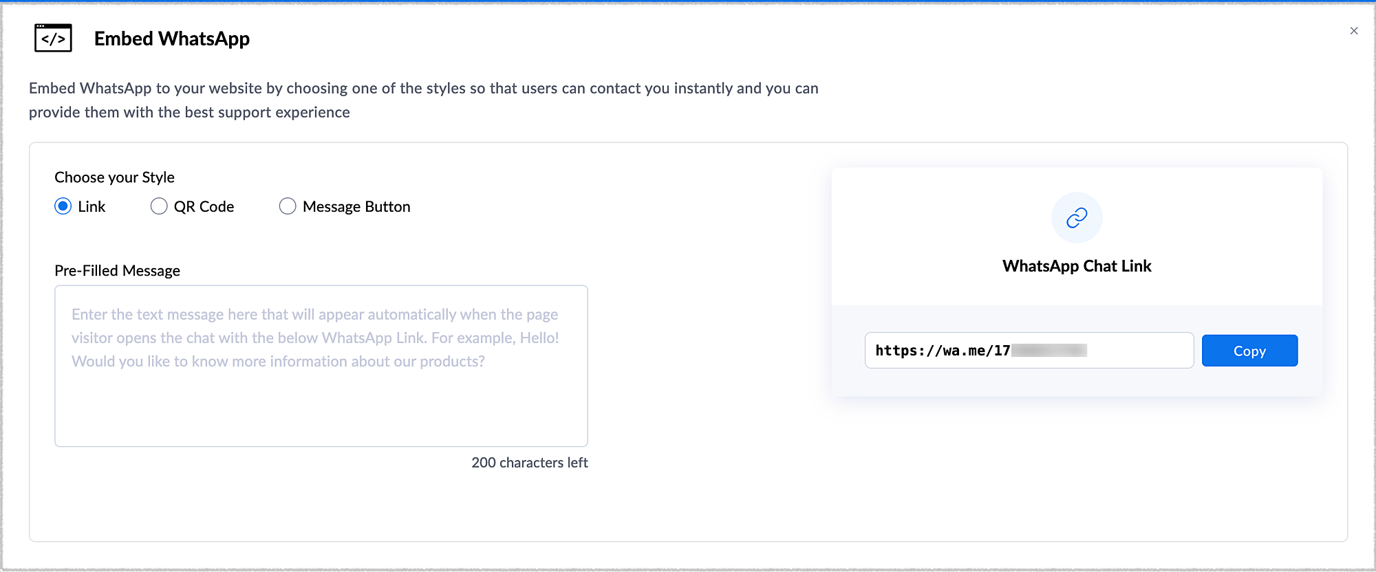 The chat link feature lets customers click on an auto-generated WhatsApp chat link (reference link) and start chatting instantly with their customers through WhatsApp.