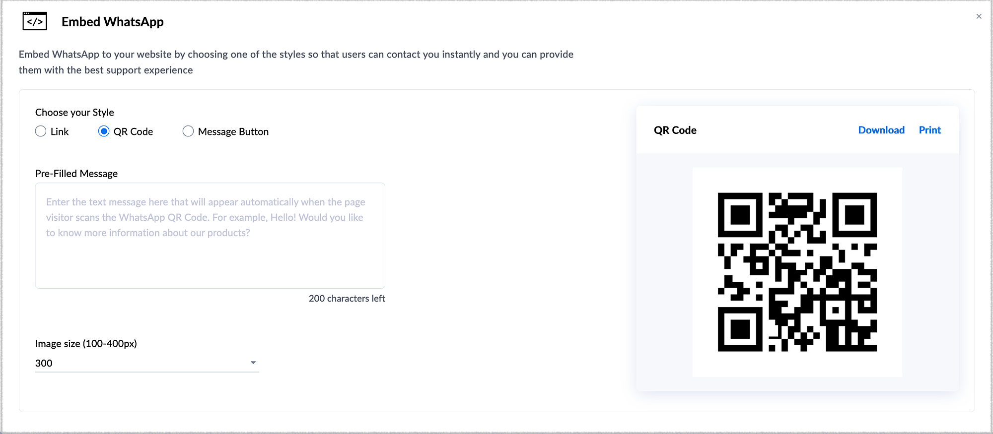 You can also start chatting by downloading an auto-generated QR code. All you need to do is download the code and paste it on your webpage. You can also display it at the store (physical outlets) for customers to quickly scan and reach out to you instantly.