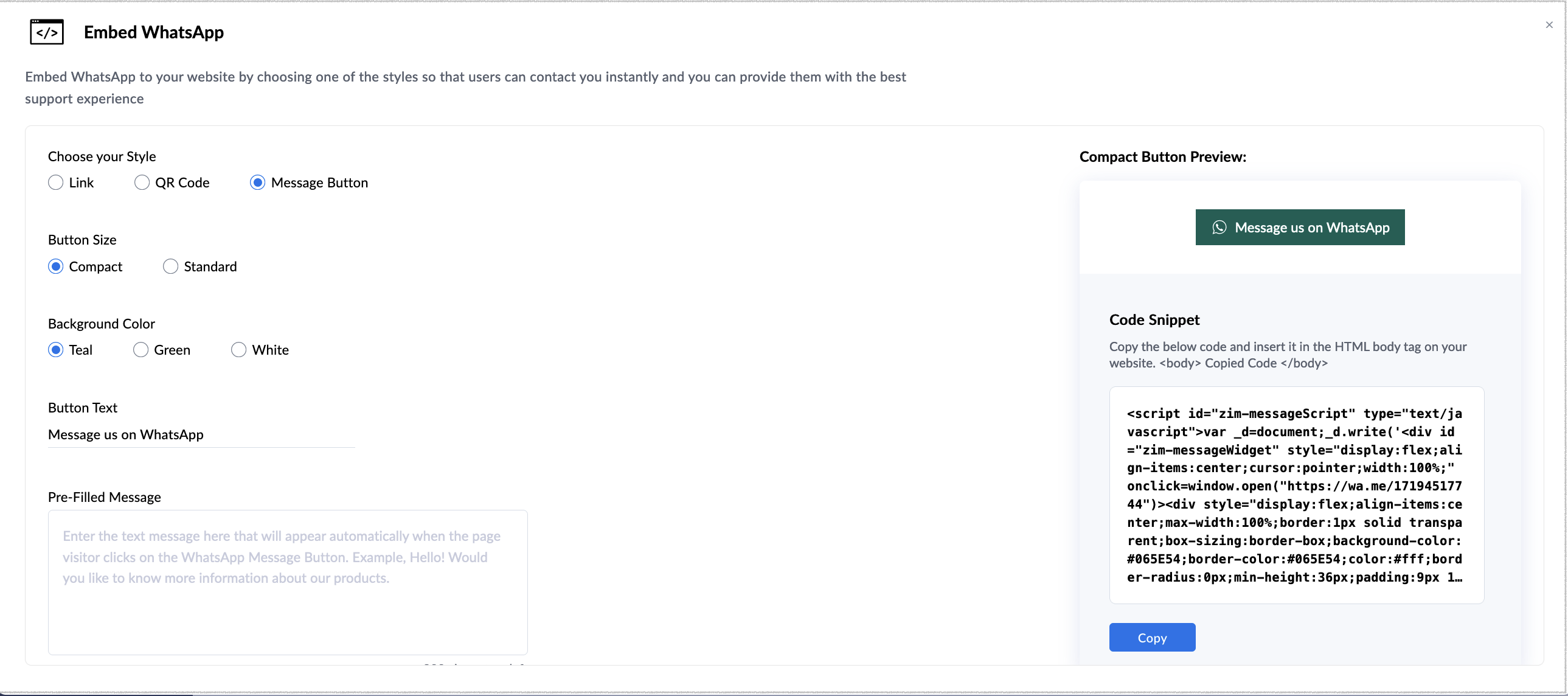 On the right-hand side of your screen, you will see the WhatsApp Chat Button Preview. You can then finalize and copy the generated code snippet.