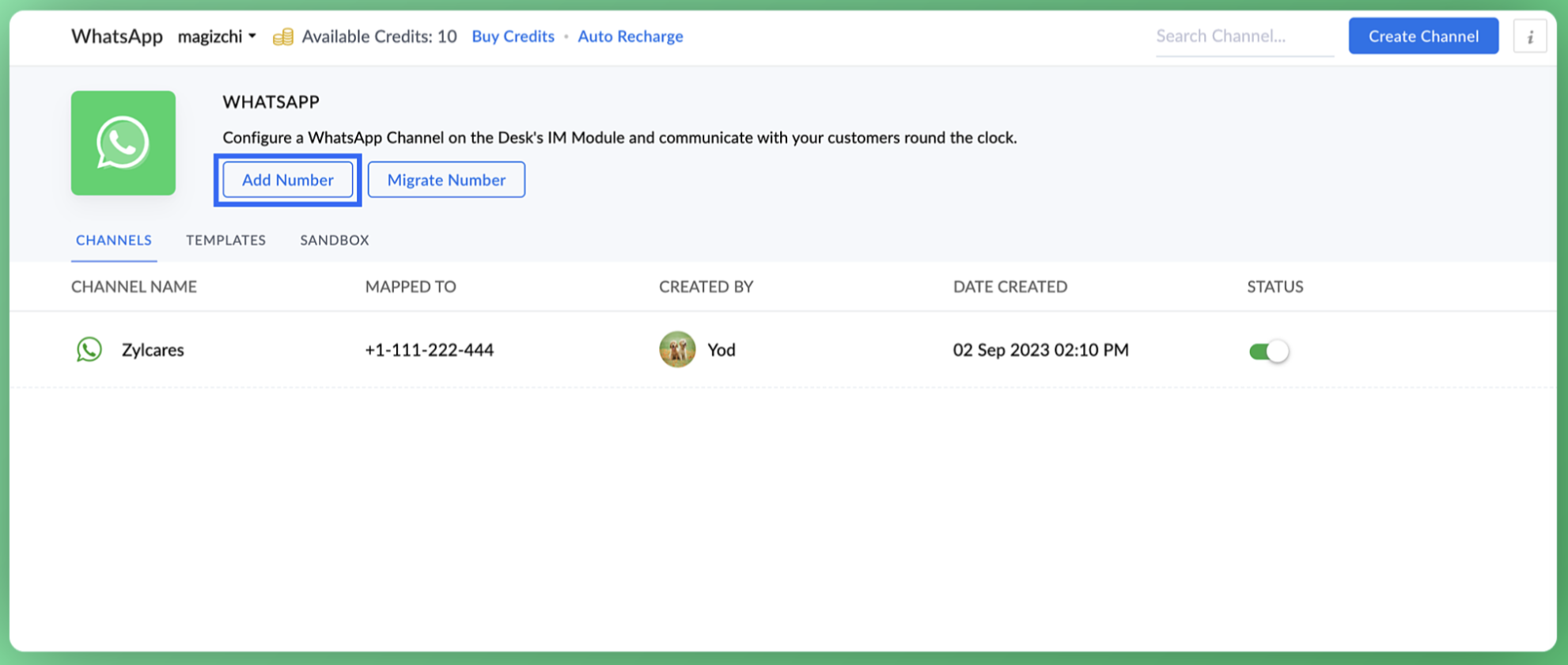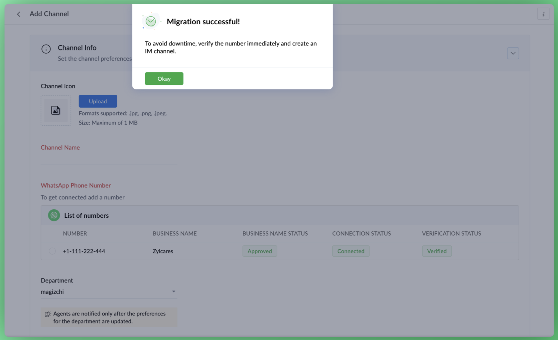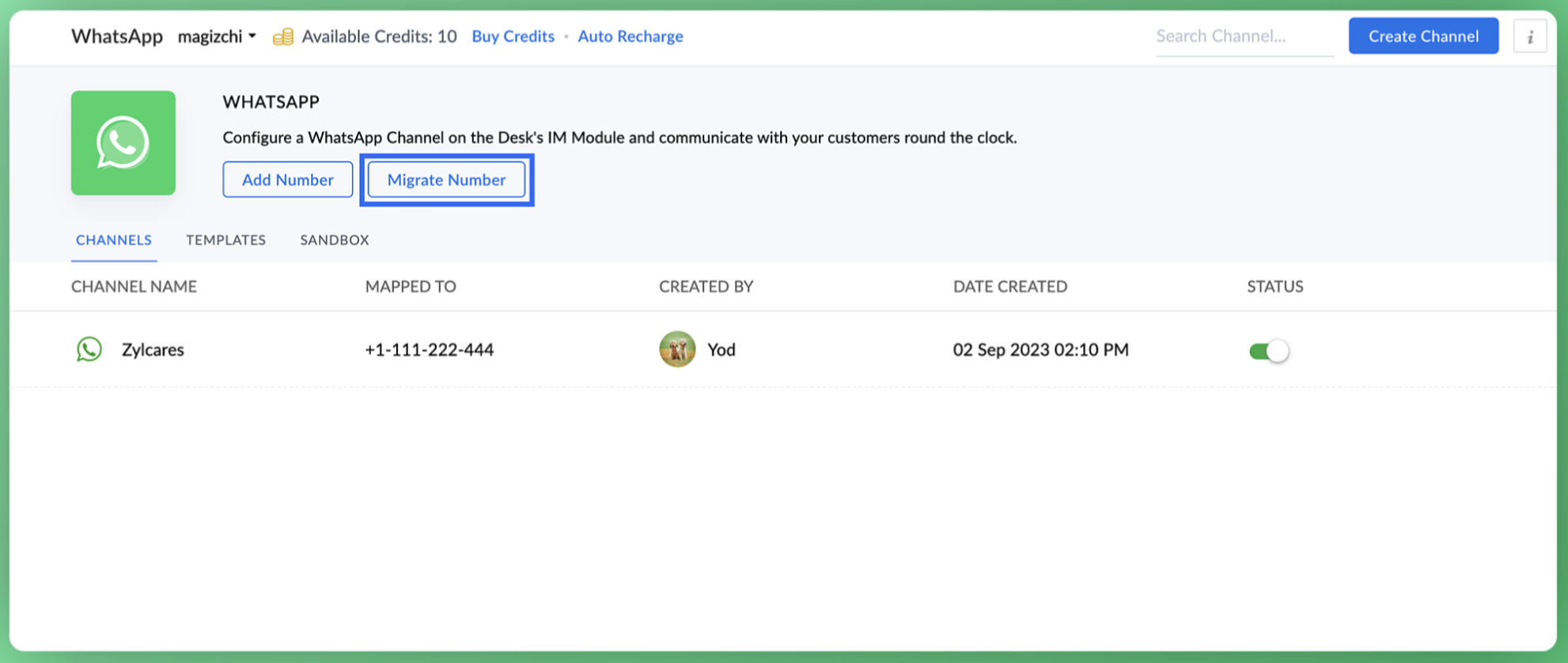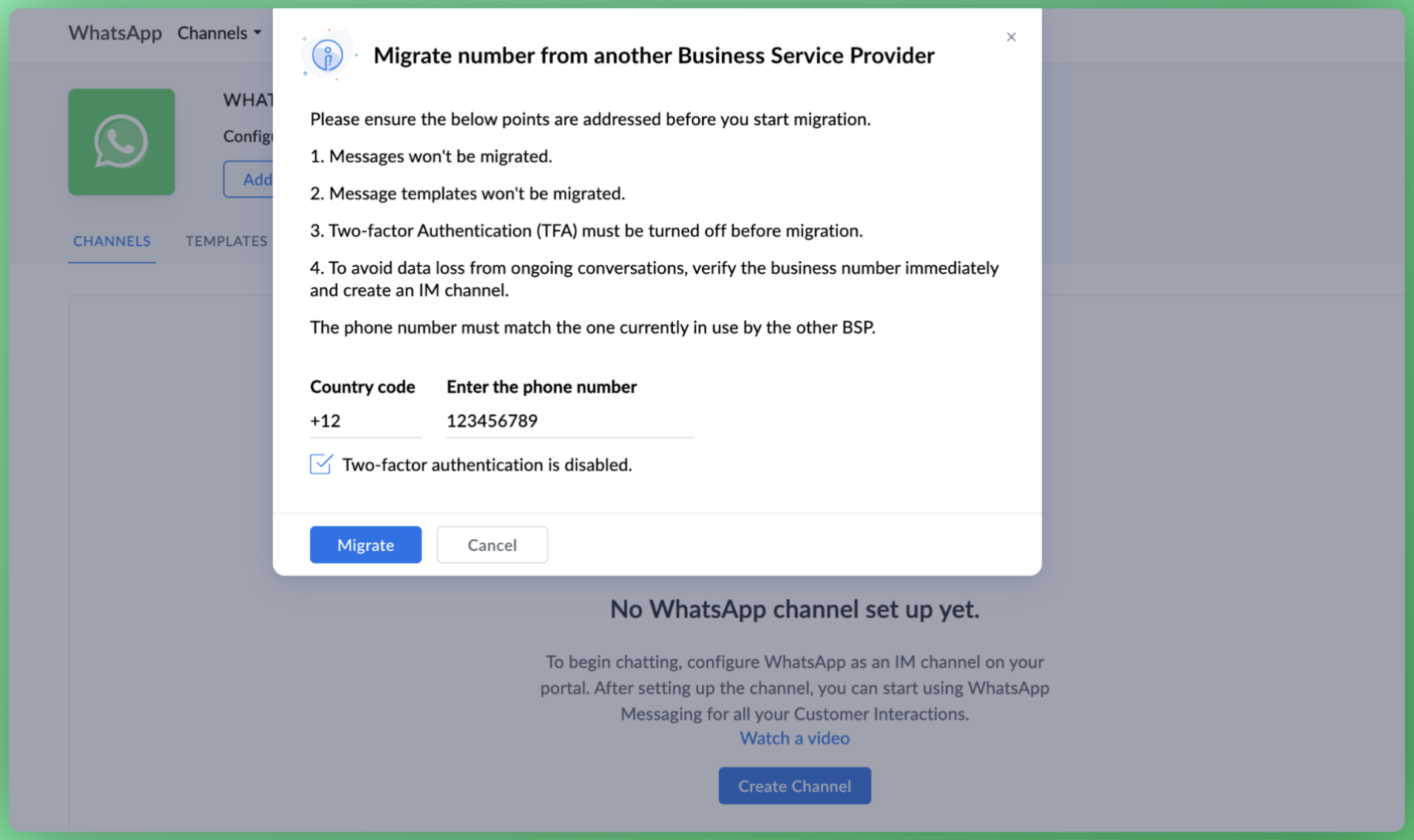 5. Click Migrate Number on the WhatsApp channel listing page.