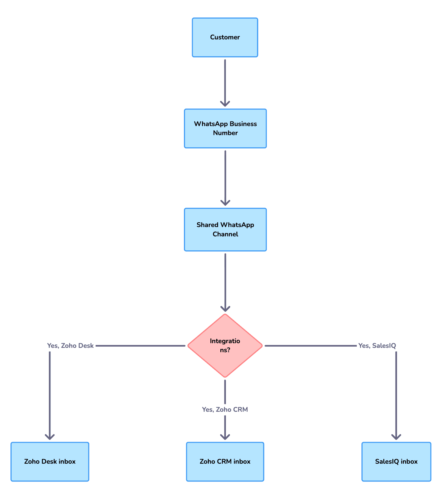 This setup allows multiple Zoho services to work from the same WhatsApp conversation, ensuring continuity and visibility across teams.